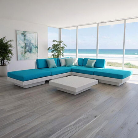 Materiales: Sala de 6 piezas modelo Casablanca (1 esquinero, 2 asientos con respaldo, 2 asientos planos con cojín, 1 mesa de centro) con estructura de aluminio tejida con rejilla sintética de alta calidad, cojinería fabricada con hule espuma de alta densidad y tela resistente al sol y la intemperie.