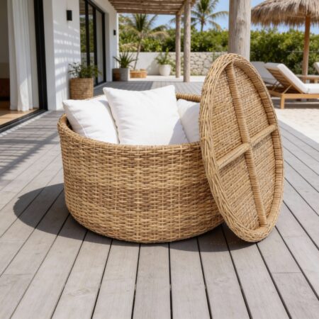 Fabricada en estructura de madera y detalles tejido con rejilla sintética.