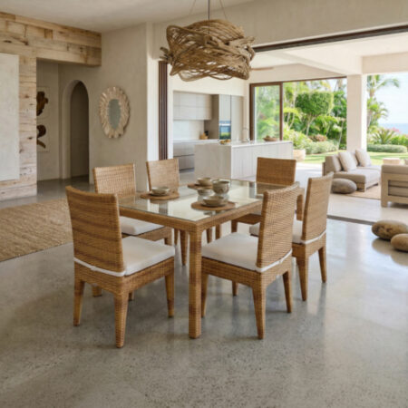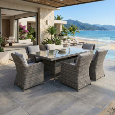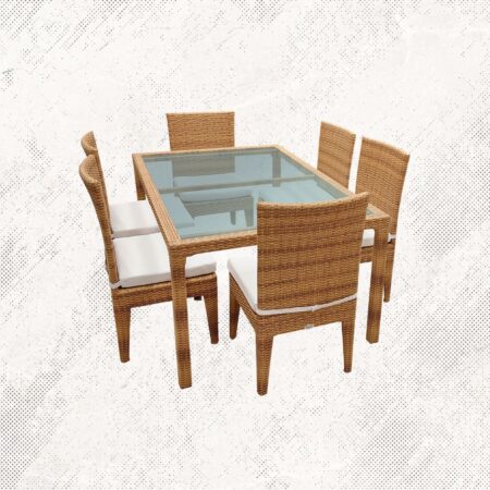 Materiales: Mesa rectangular con cubierta de cristal y 6 sillas modelo Sacramento, estructura de aluminio tejida con rattan sintético, cojineria fabricada con hule espuma de alta densidad y tela resistente al sol y la intemperie.