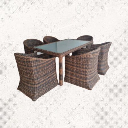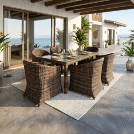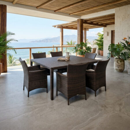 Materiales: Mesa rectangular con cubierta de cristal o marol y 6 sillas modelo San Diego. Estructura de aluminio tejida con rattan sintético, cojineria fabricada con hule espuma de alta densidad y tela resistente al sol y la intemperie.