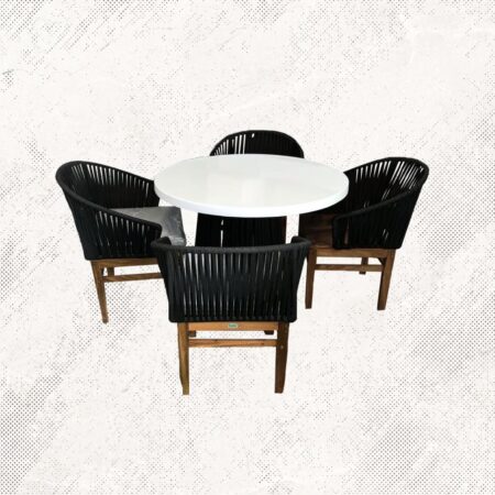 Materiales: Mesa redonda con estructura y cubierta de madera de teca y 4 sillas modelo Victoria, tejidas con rejilla sintético y una base de madera de teca, cojines en tela resistente al sol y la intemperie.