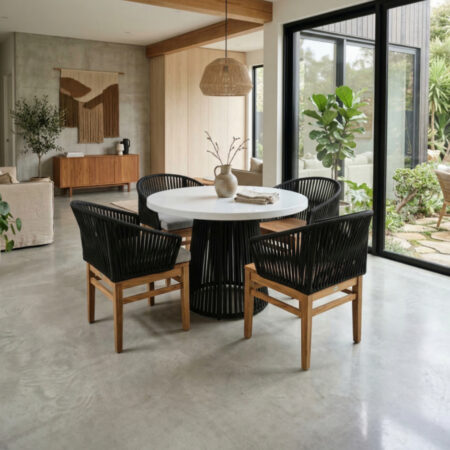Materiales: Mesa redonda con estructura y cubierta de madera de teca y 4 sillas modelo Calgary, tejidas con rejilla sintético y una base de madera de teca, cojines en tela resistente al sol y la intemperie.