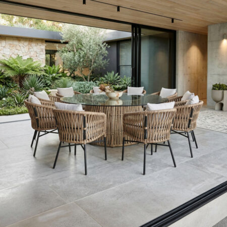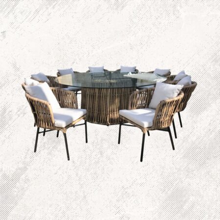 Materiales: Mesa redonda con estructura de aluminio y una cubierta de cristal templado, 10 sillas modelo Aveiro tejidas con rejilla sintética, cojineria en tela resistente al sol y la intemperie.