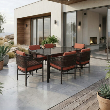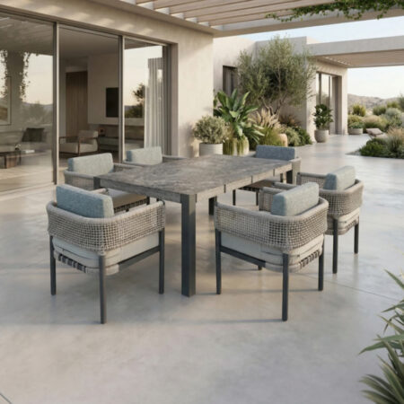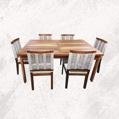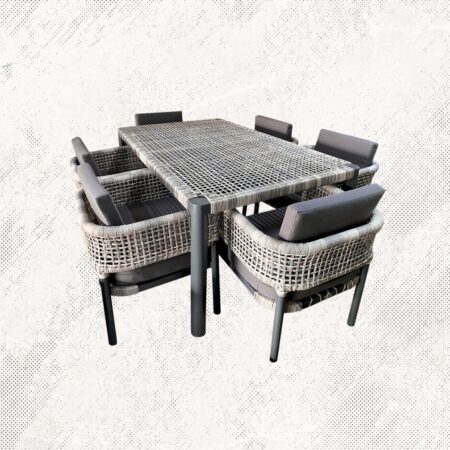 Materiales: Mesa rectangular con estructura de aluminio tejida con rejilla sintética y una cubierta de cristal templado, 6 sillas modelo Stregis tejidas con rejilla sintética, cojineria en tela resistente al sol y la intemperie.