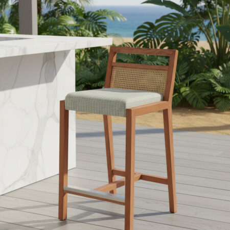 Materiales: Estructura de madera y aluminio, tejido con rejilla sintética de alta calidad, cojineria con espuma de alta densidad, funda interna y externa en tela resistente al sol y la intemperie con cierres reforzados.