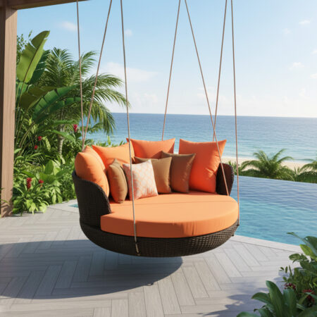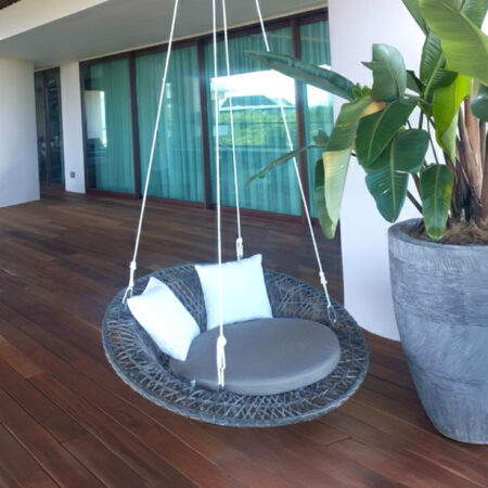 Estructura de aluminio, tejido con rejilla sintética de alta calidad, cojines en tela sumbrella con espuma de alta densidad.