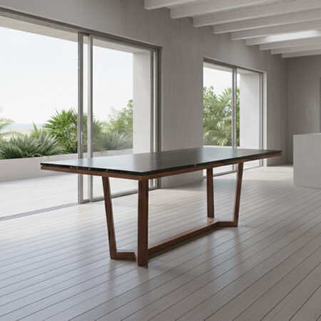 Materiales: Mesa rectangular para 6 sillas, con cubierta de piedra y base de madera.