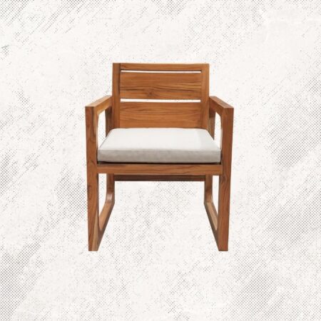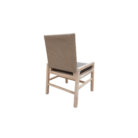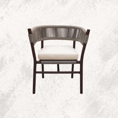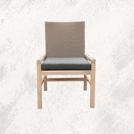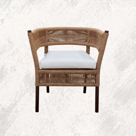 Materiales: Armazón de aluminio y madera, tejido con rejilla sintética, cojín hule espuma de alta densidad, funda interna, funda externa en tela resistente al sol y la intemperie con cierres reforzados.