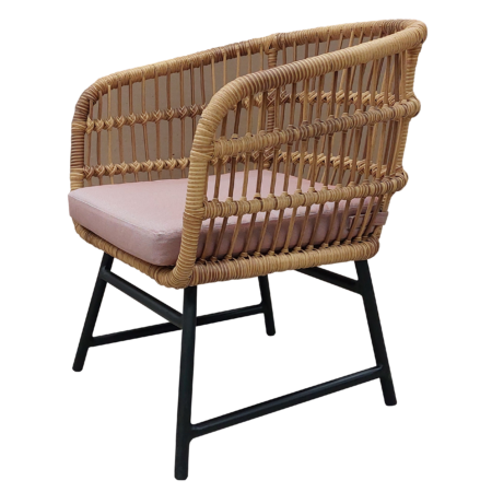 Estructura en aluminio, tejido con rattan sintético, cojineria fabricada con hule espuma de alta densidad y tela resistente al sol y la intemperie.