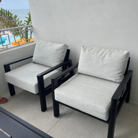 Materiales: Estructura de aluminio, tejido con rejilla sintética de alta calidad, cojineria con espuma de alta densidad.