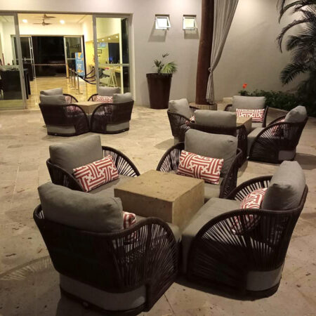 Estructura en aluminio, tejido con rejilla sintética, cojineria fabricada con hule espuma de alta densidad y tela resistente al sol y la intemperie