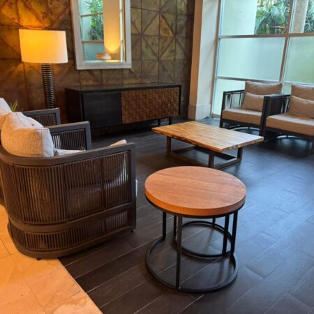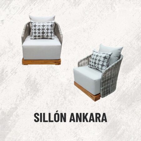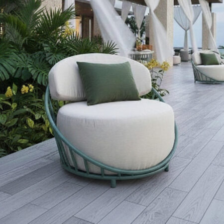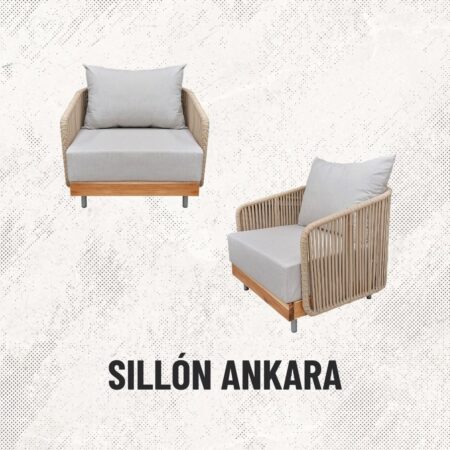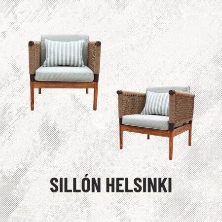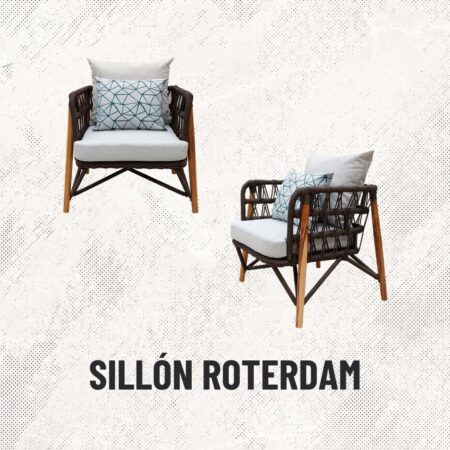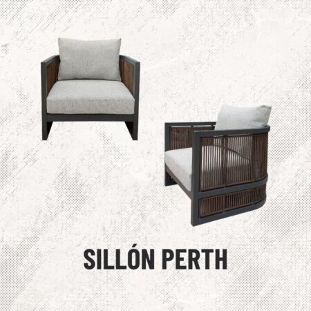 Sillón individual, fabricado con estructura de aluminio, Base de madera y tejido con rejilla sintética, cojinería fabricada con hule espuma de alta densidad y tela resistente al sol y la intemperie.