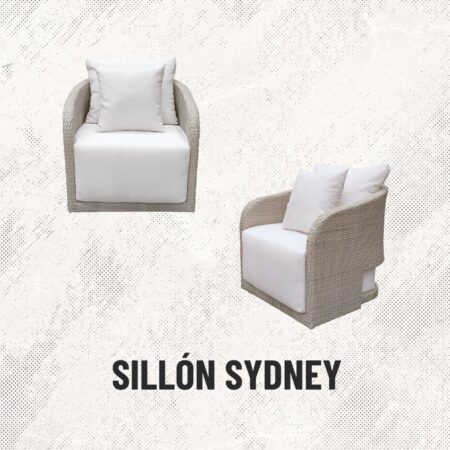 Sillón individual, fabricado con estructura de aluminio, tejidas con rejilla sintética, cojinería fabricada con hule espuma de alta densidad y tela resistente al sol y la intemperie.
