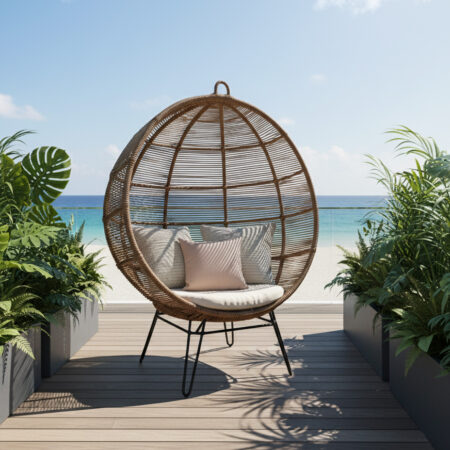 Estructura en aluminio, tejido con rattan sintético, cojineria fabricada con hule espuma de alta densidad y tela resistente al sol y la intemperie.