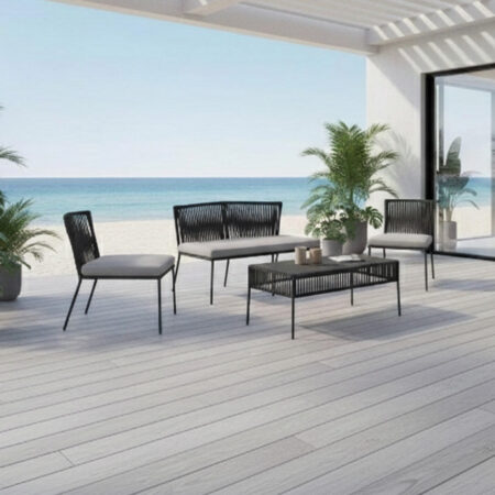 Estructura de aluminio tejida con rattan sintético. Cojines en tela Sumbrella y mesa de centro con cubierta de cristal.