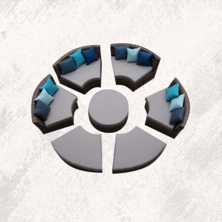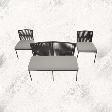 Materiales: Sala con estructura de aluminio, tejida con rejilla sintética de alta calidad, cojinería fabricada con hule espuma de alta densidad y tela resistente al sol y la intemperie.