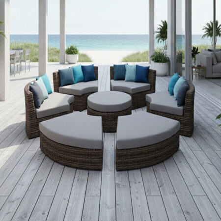 Armazón de aluminio, tejido con hilo, cojines en tela sumbrella, hule espuma de alta densidad.