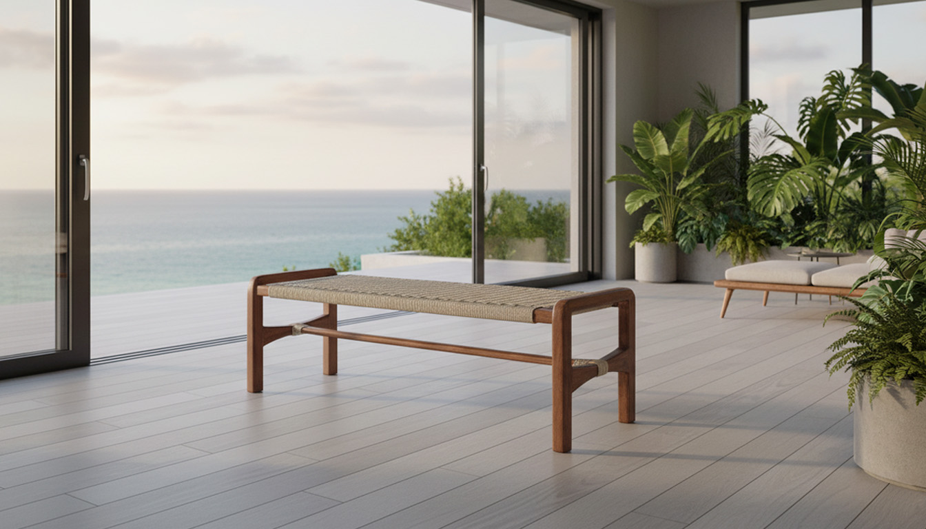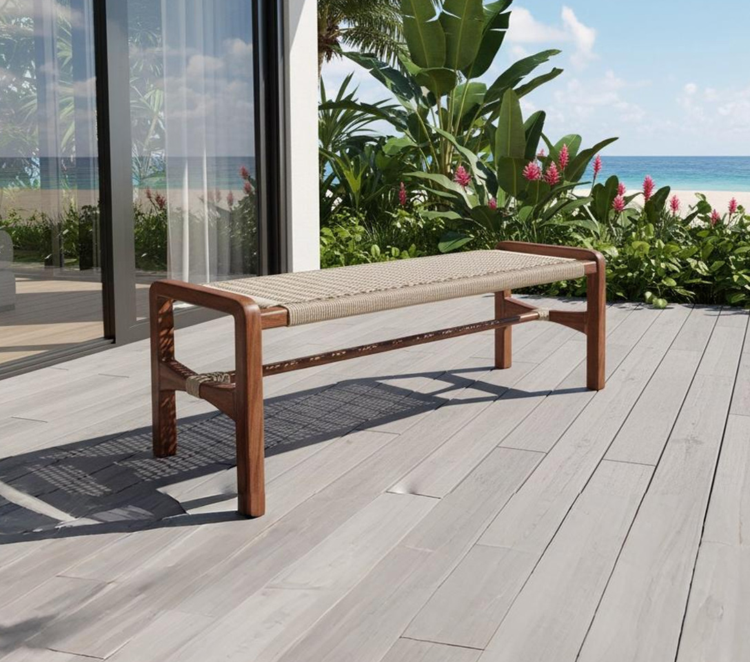 Materiales: Estructura de madera, tejido con rejilla sintética de alta calidad, cojineria con espuma de alta densidad.