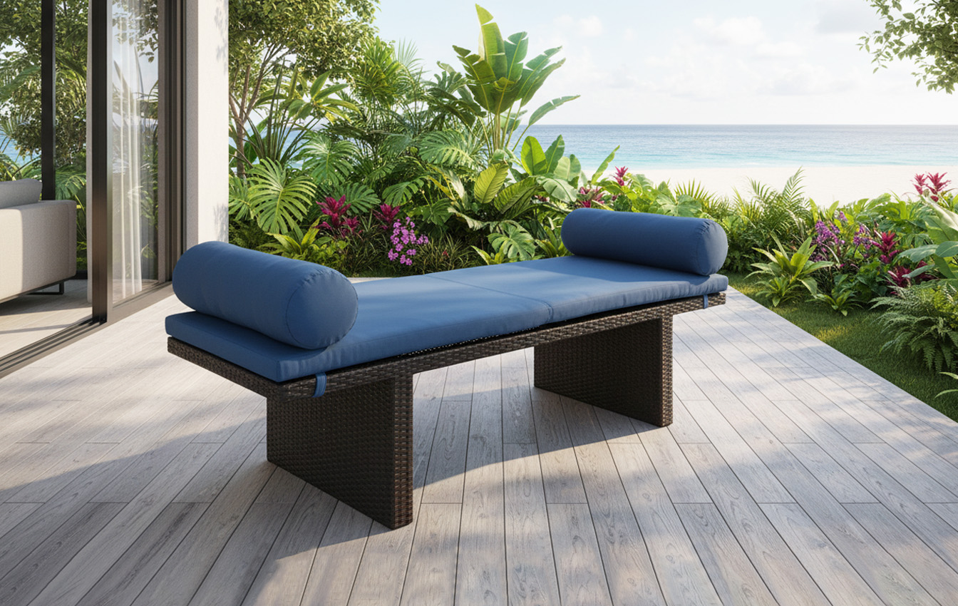 Materiales: Estructura de madera, tejido con rejilla sintética de alta calidad, cojineria con espuma de alta densidad.
