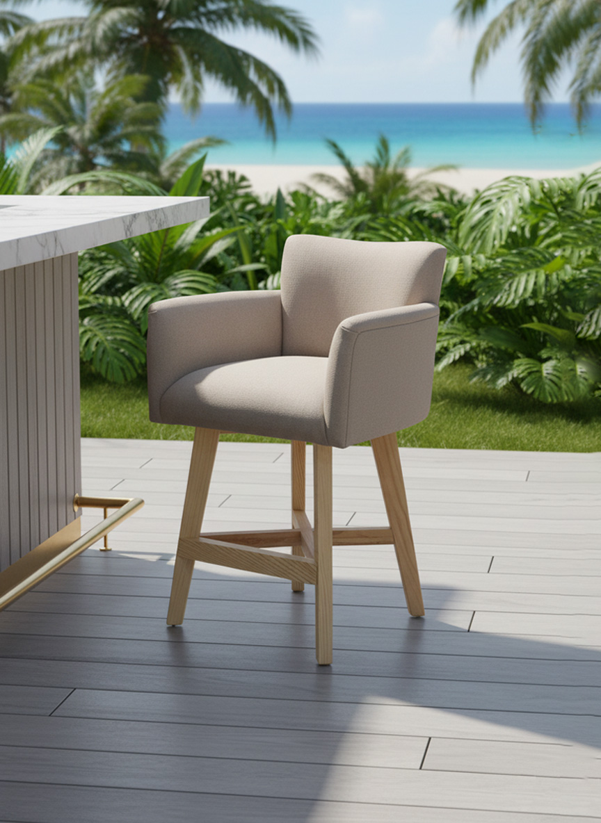 Materiales: Armazón de madera, tejido con rejilla sintética, cojín hule espuma de alta densidad, funda interna, funda externa en tela resistente al sol y la intemperie con cierres reforzados.