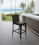 Estructura de aluminio tejida con rattan sintético, cojines en tela Sumbrella y mesa de centro con cubierta de cristal.