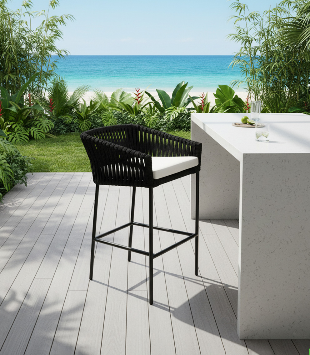Materiales: Armazón de madera, tejido con rejilla sintética, cojín hule espuma de alta densidad, funda interna, funda externa en tela resistente al sol y la intemperie con cierres reforzados.