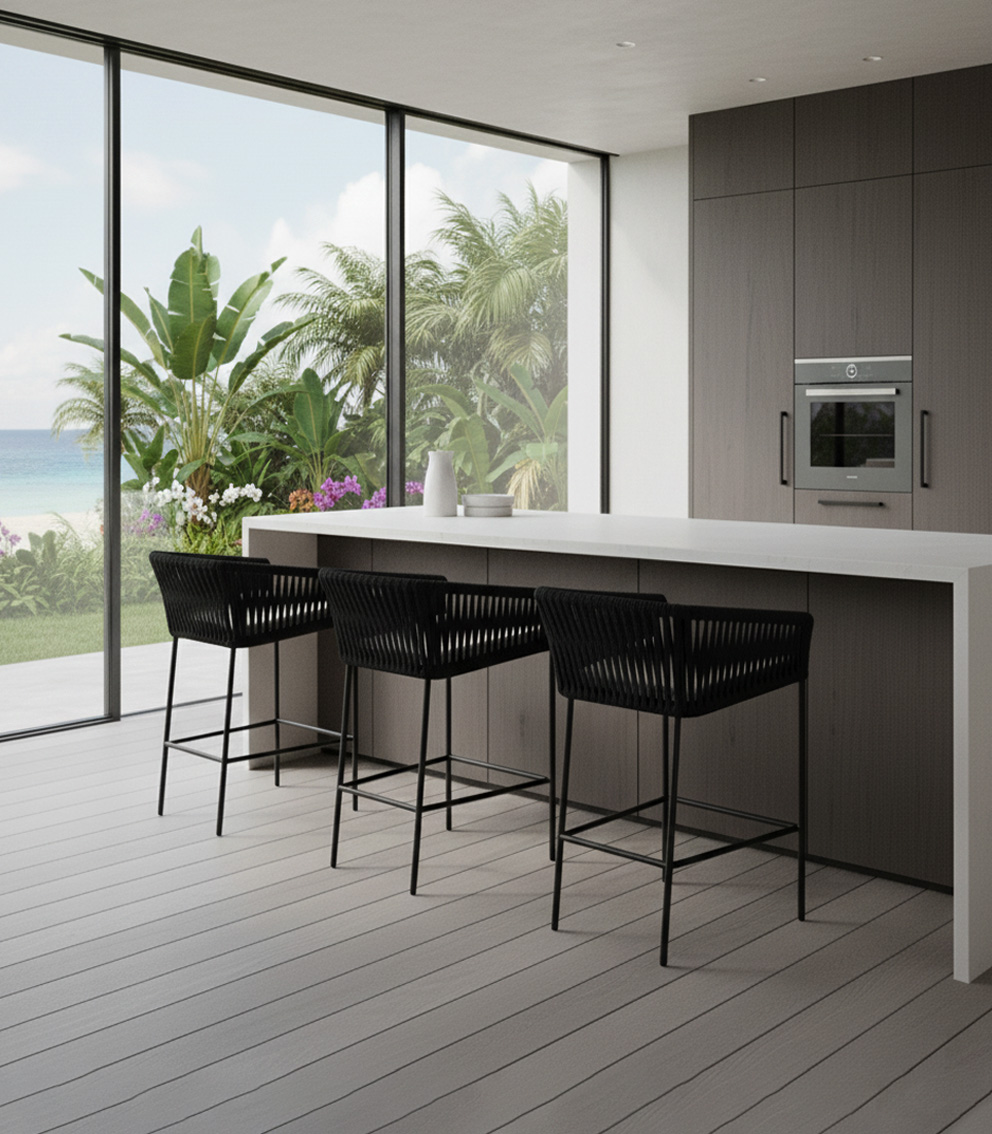Materiales: Estructura de madera, tejido con rejilla sintética de alta calidad, cojineria con espuma de alta densidad.