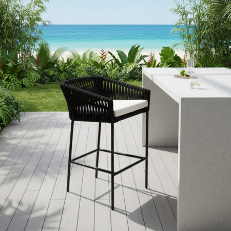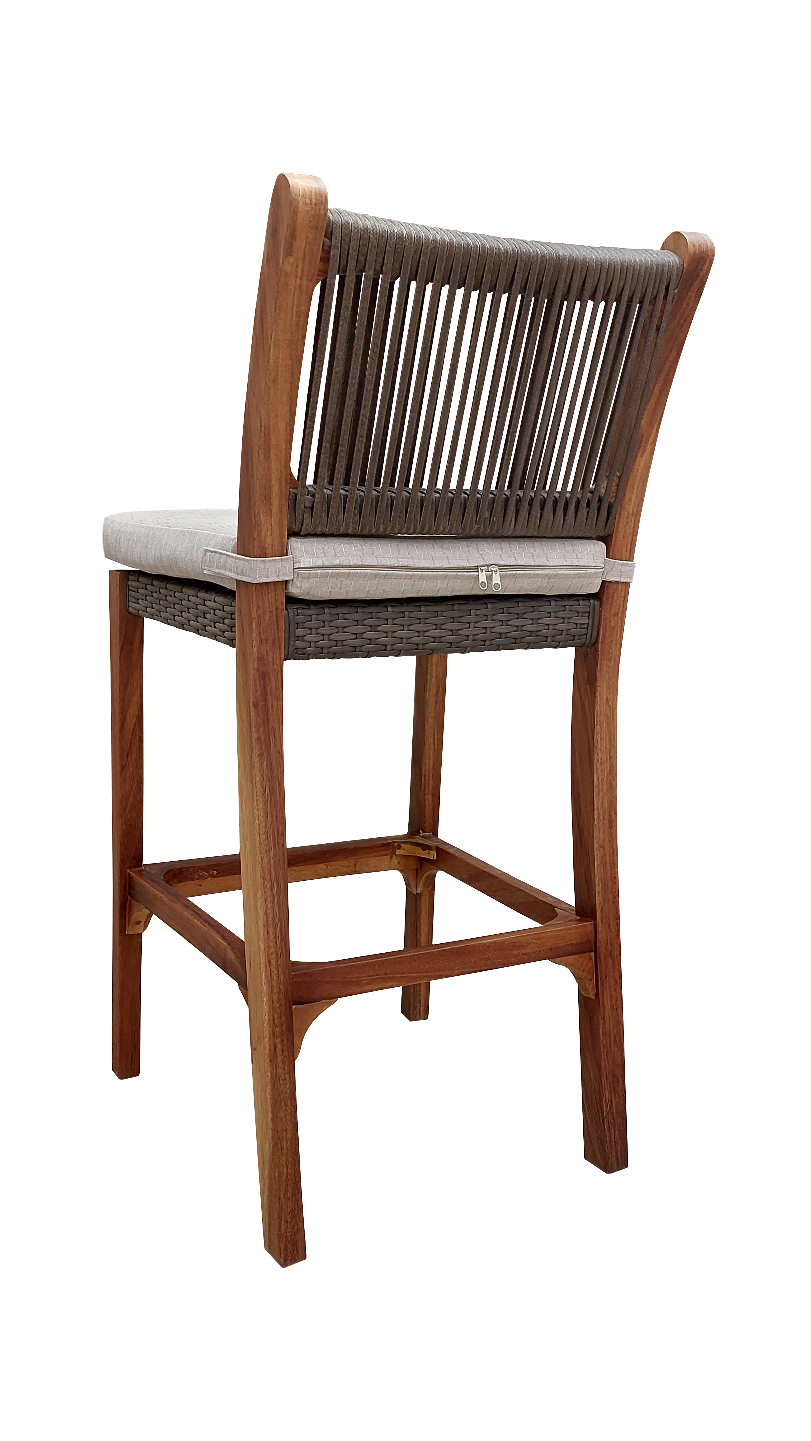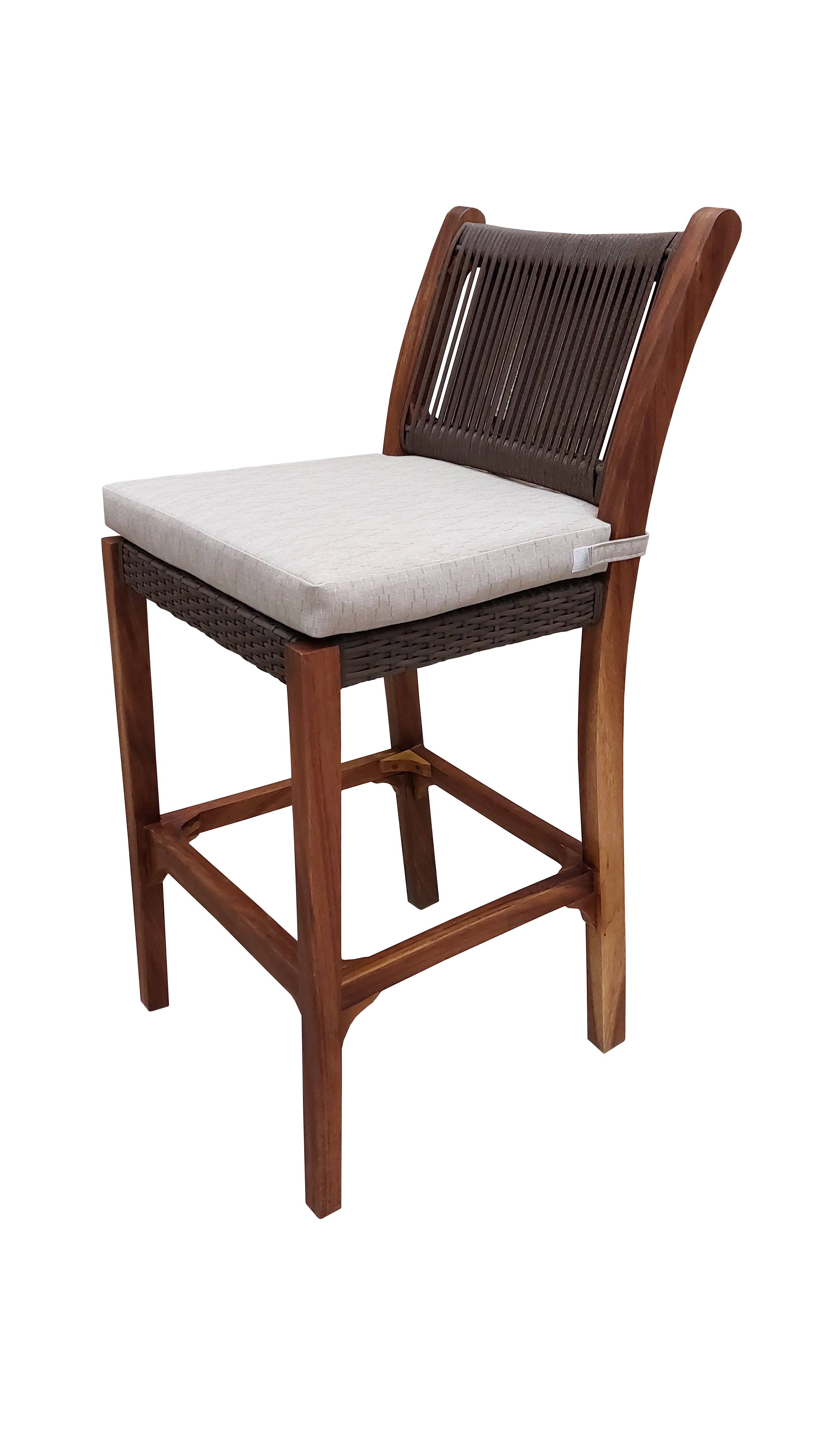 Materiales: Armazón de madera, tejido con rejilla sintética, cojín hule espuma de alta densidad, funda interna, funda externa en tela resistente al sol y la intemperie con cierres reforzados.