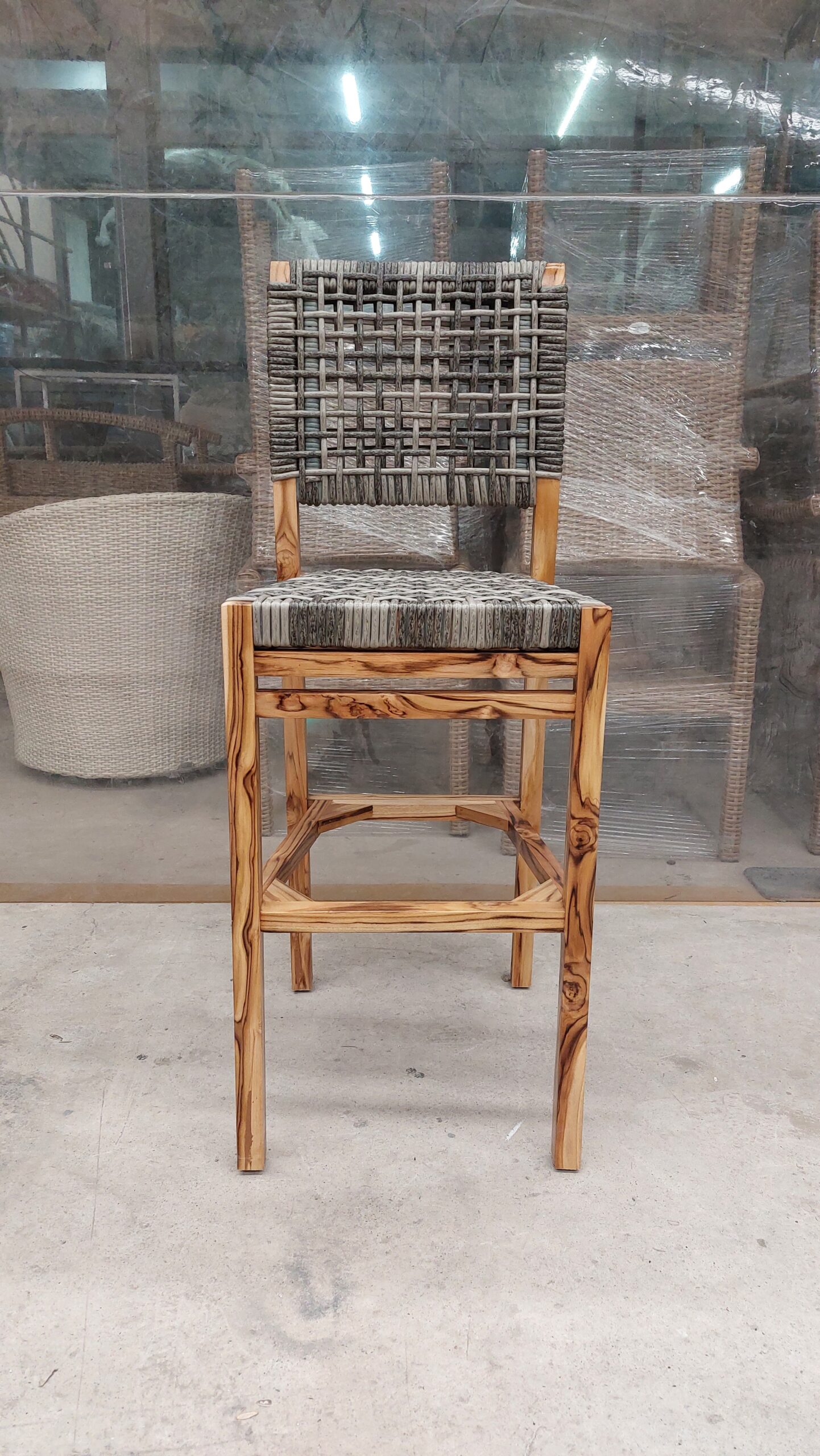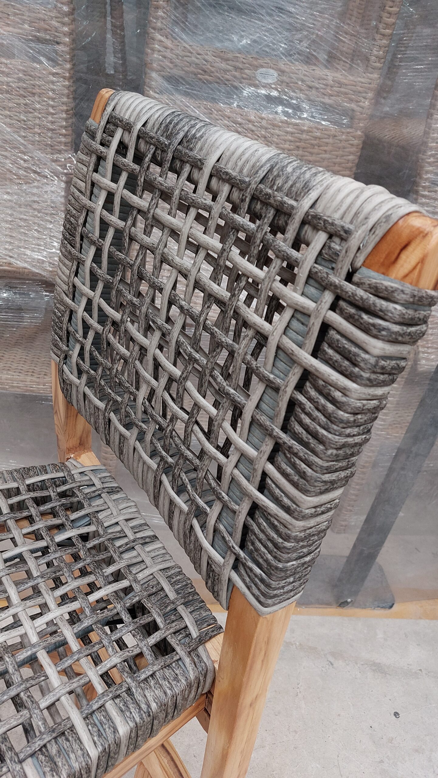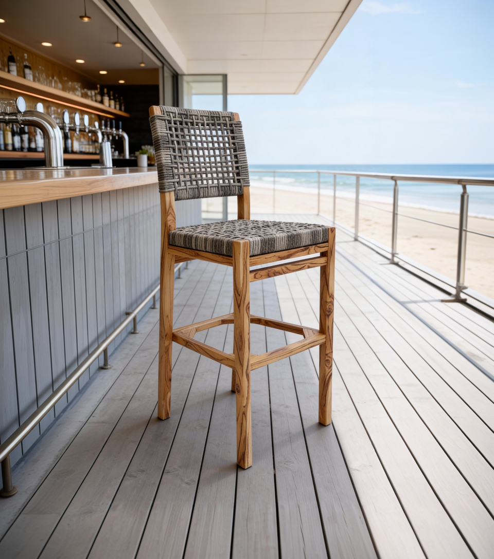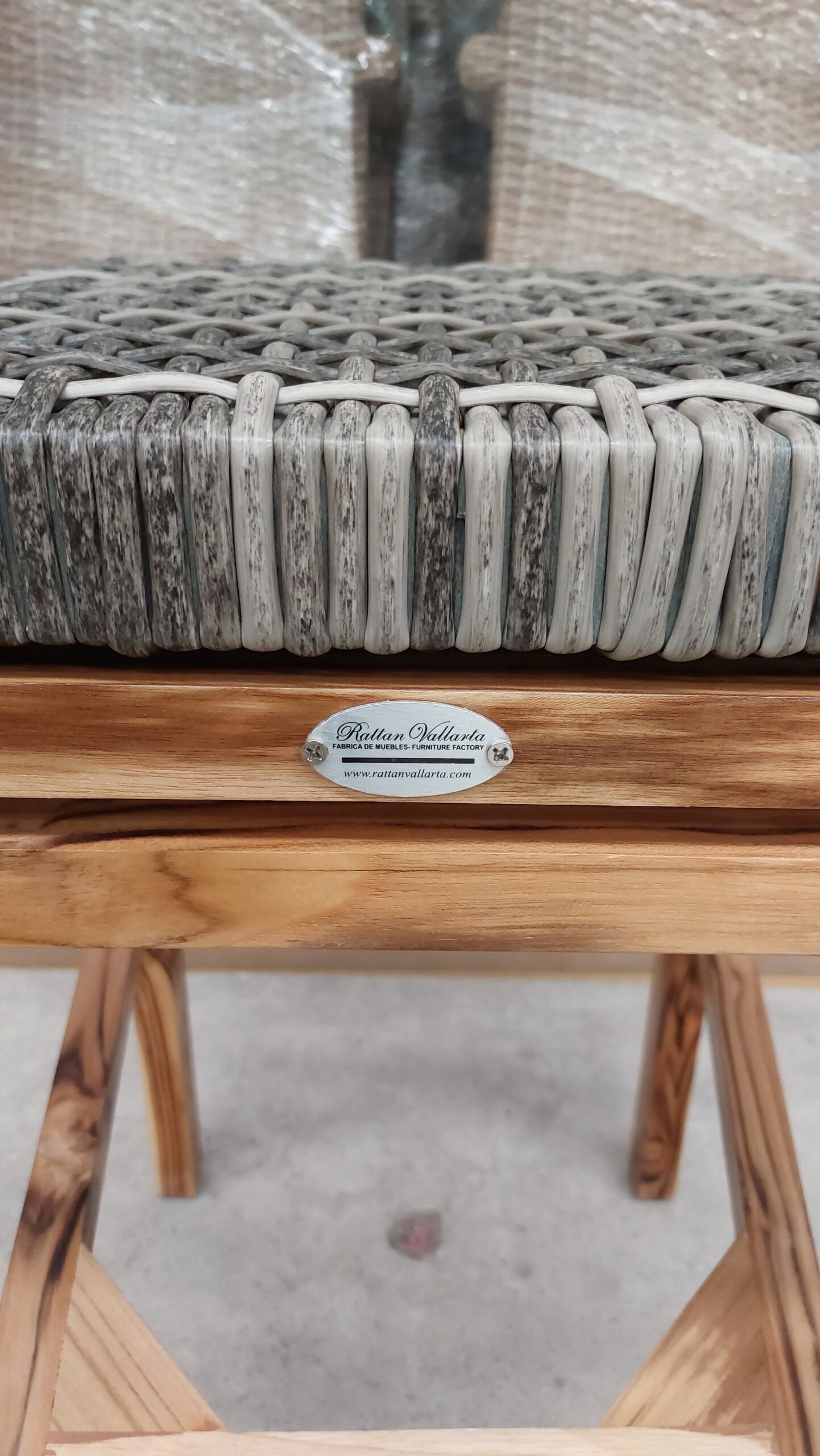 Materiales: Armazón de madera, tejido con rejilla sintética, cojín hule espuma de alta densidad, funda interna, funda externa en tela resistente al sol y la intemperie con cierres reforzados.