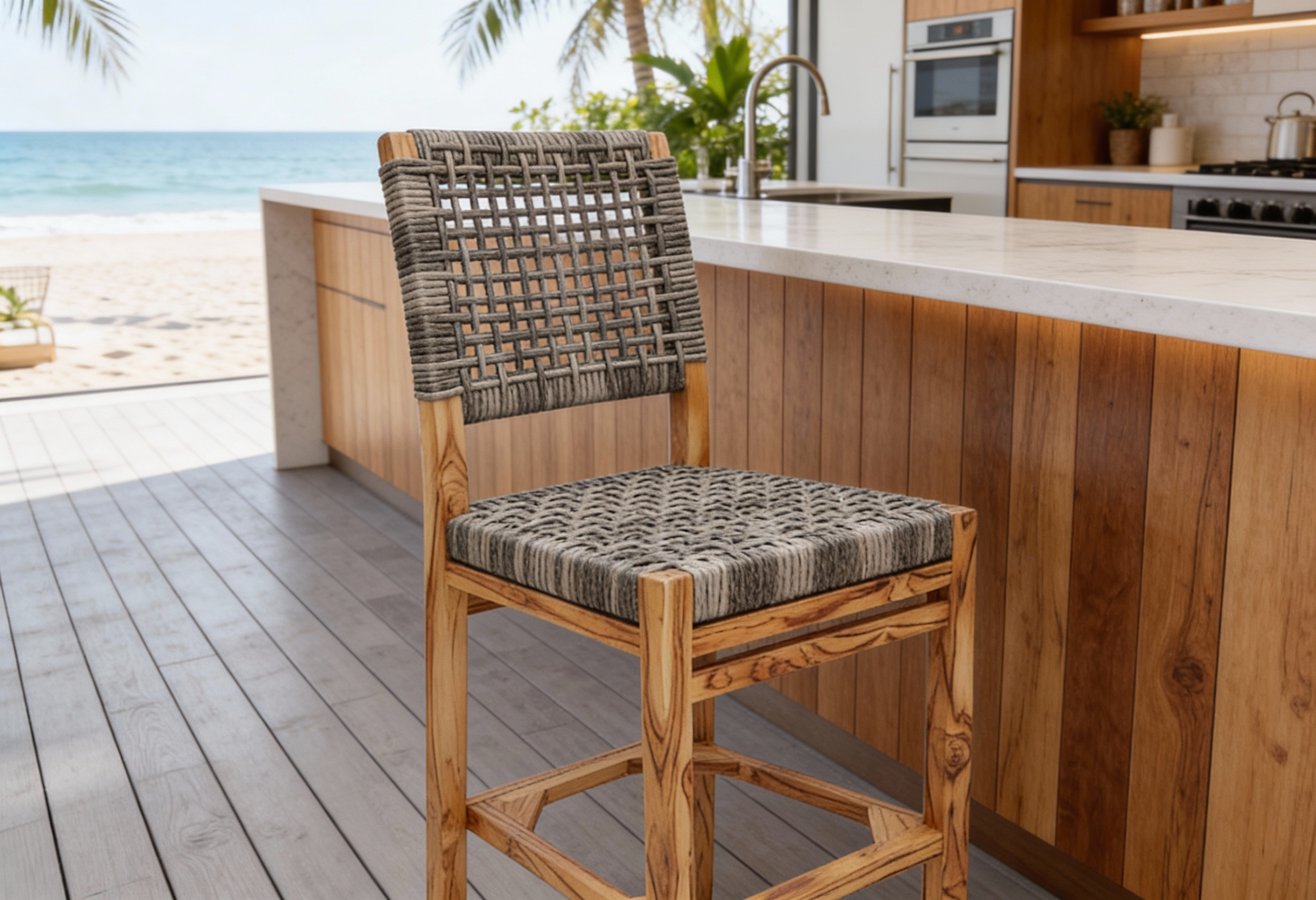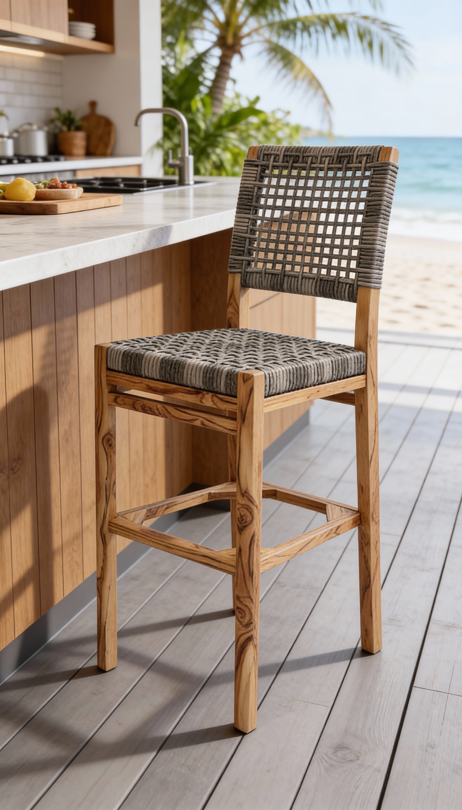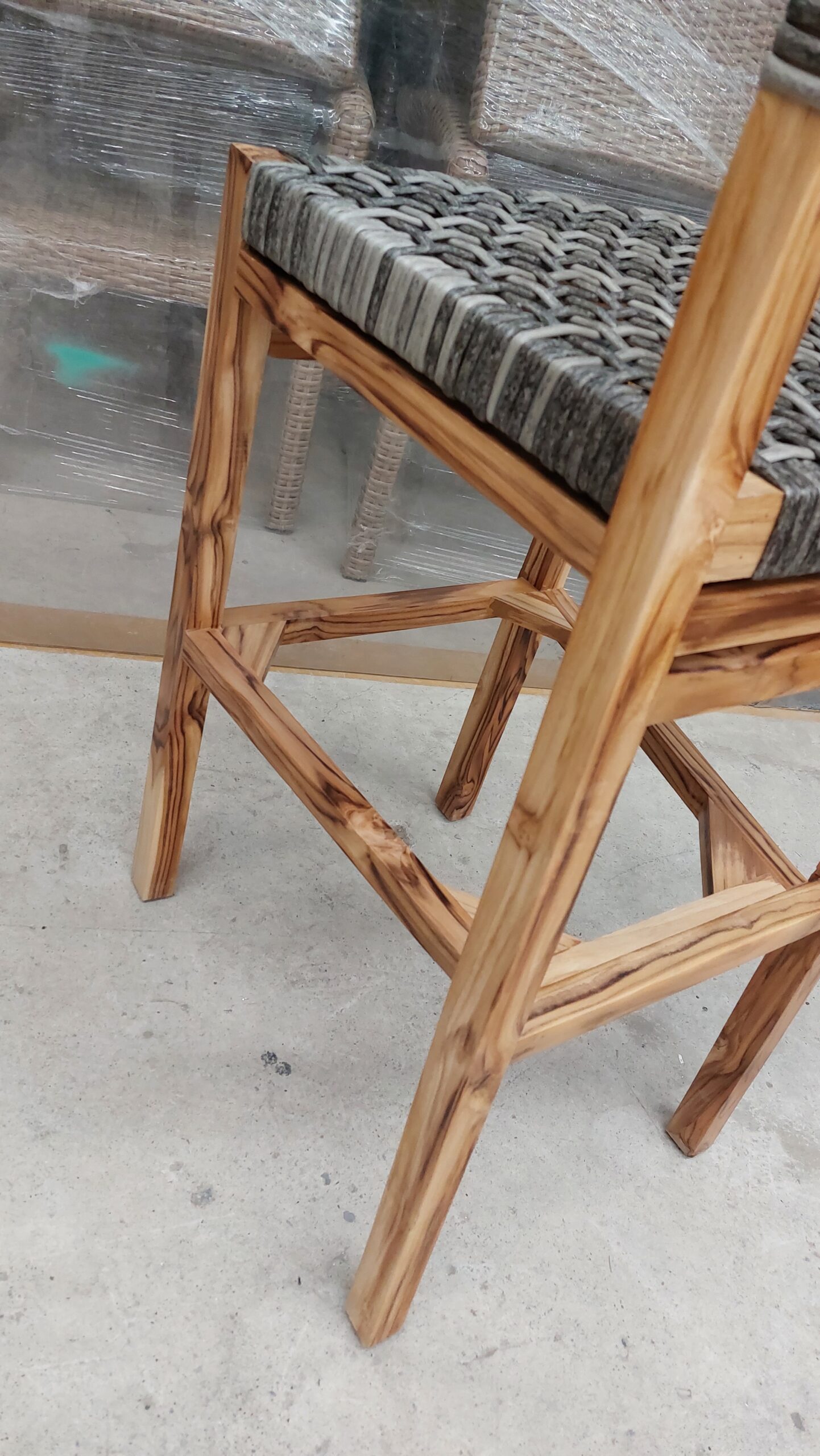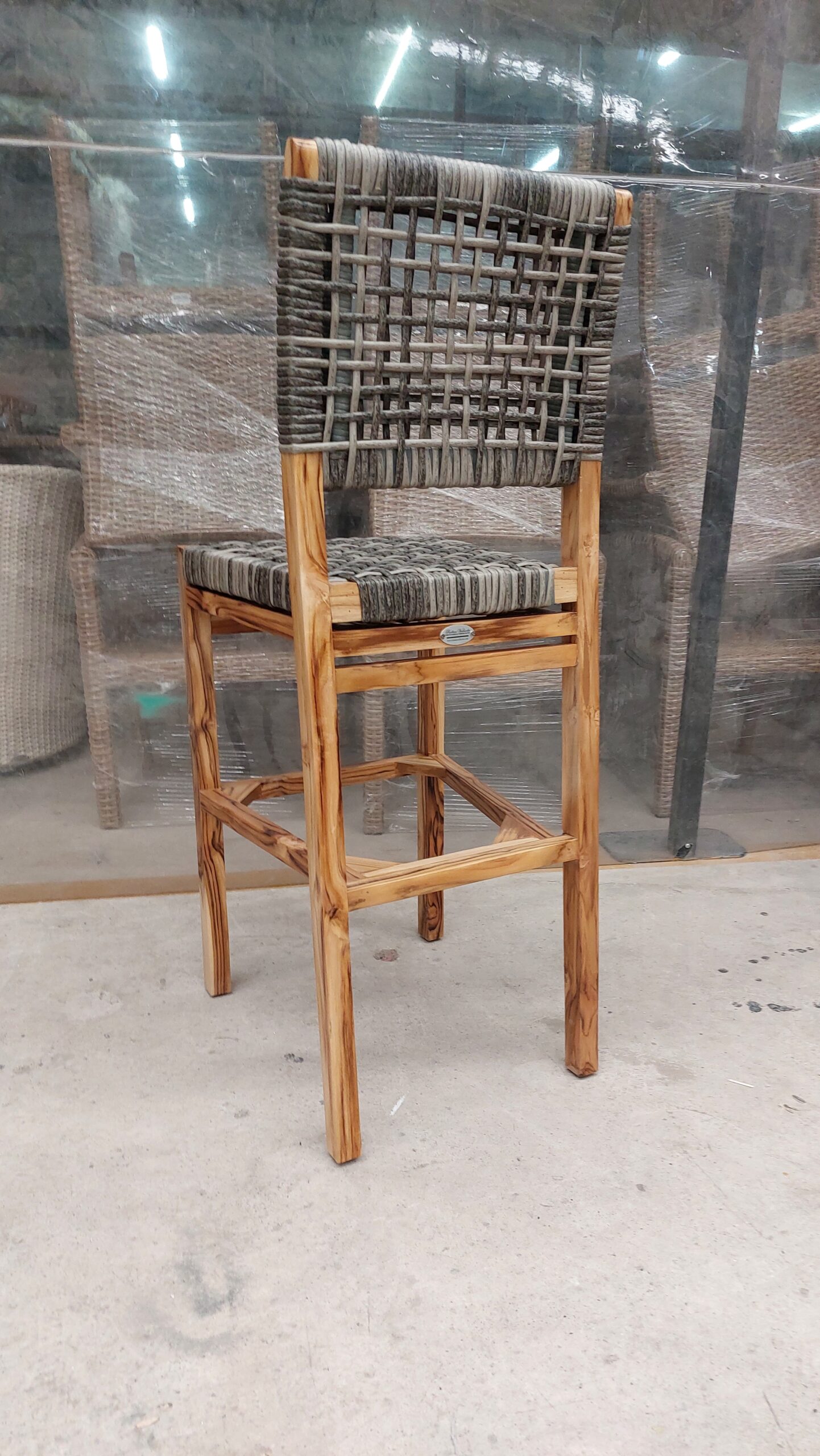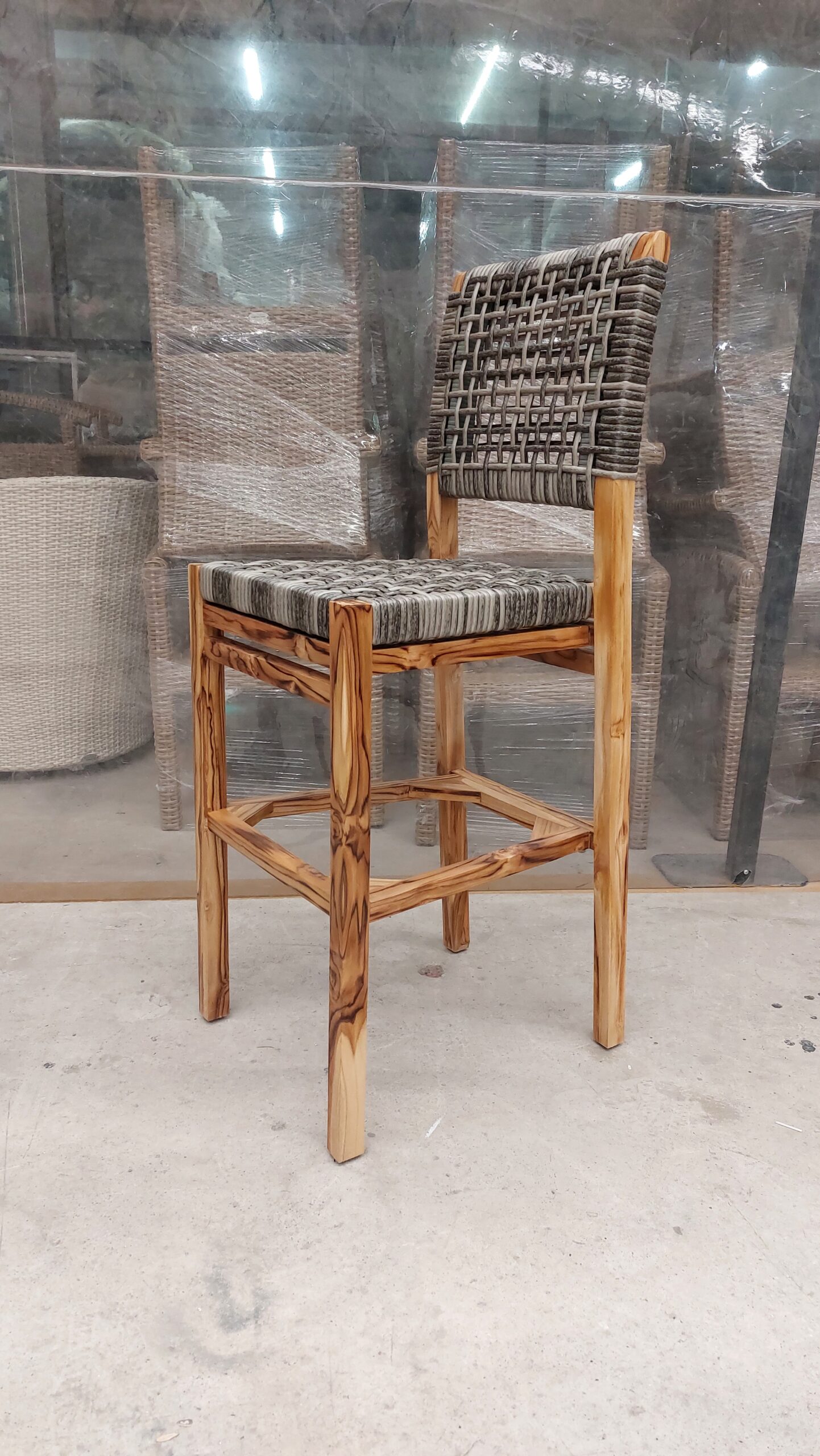Materiales: Armazón de madera, tejido con rejilla sintética, cojín hule espuma de alta densidad, funda interna, funda externa en tela resistente al sol y la intemperie con cierres reforzados.