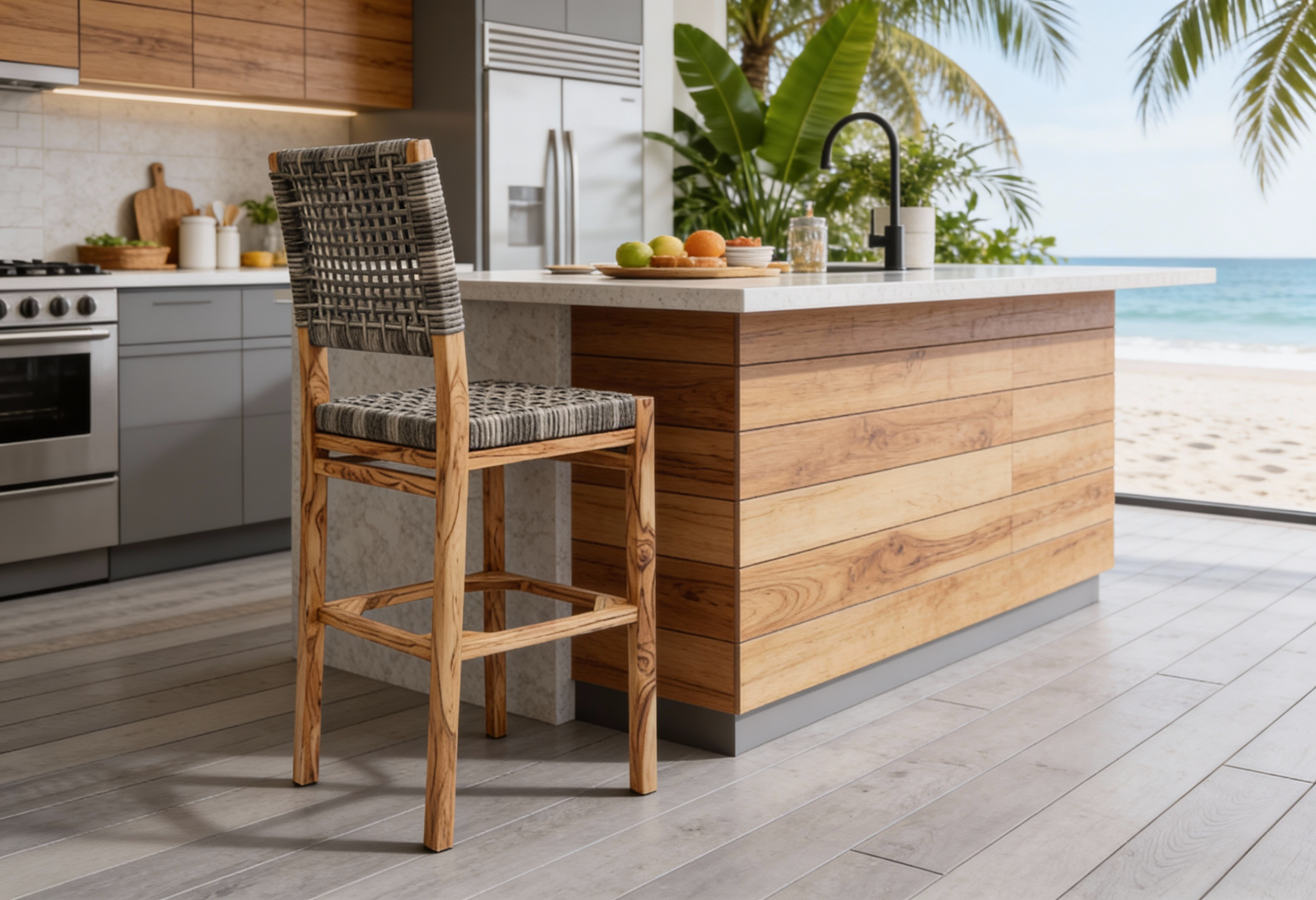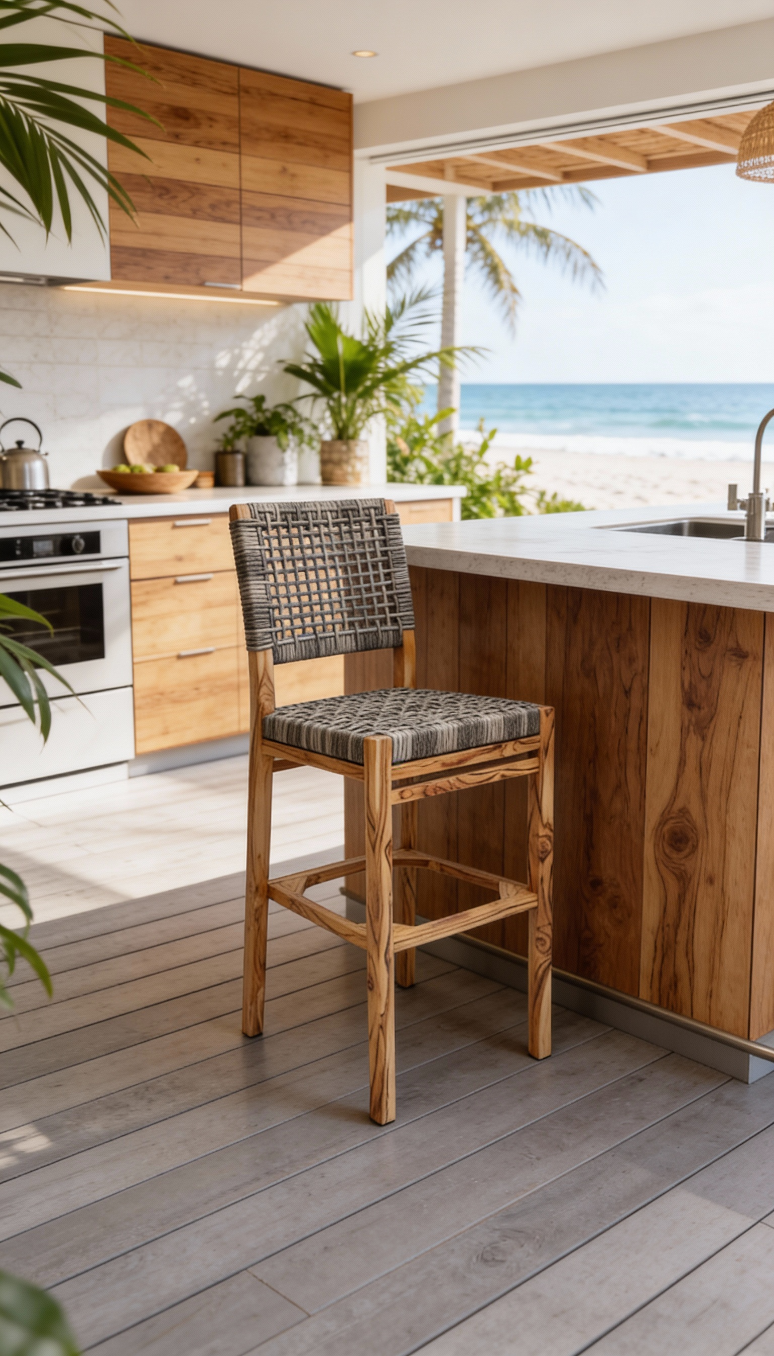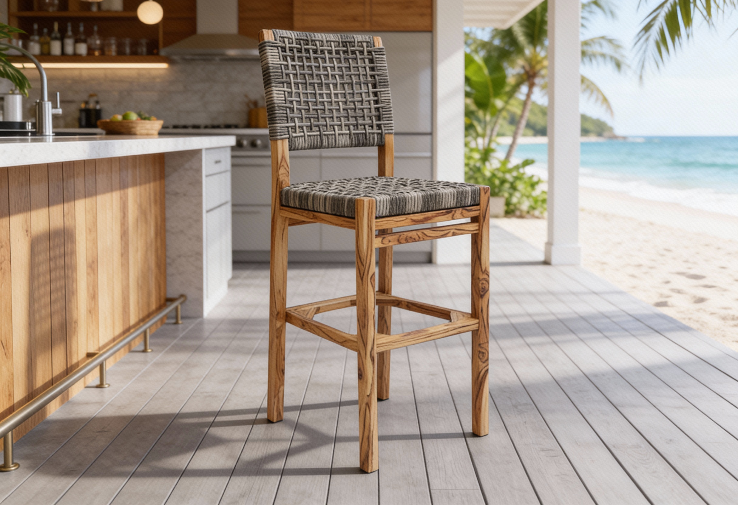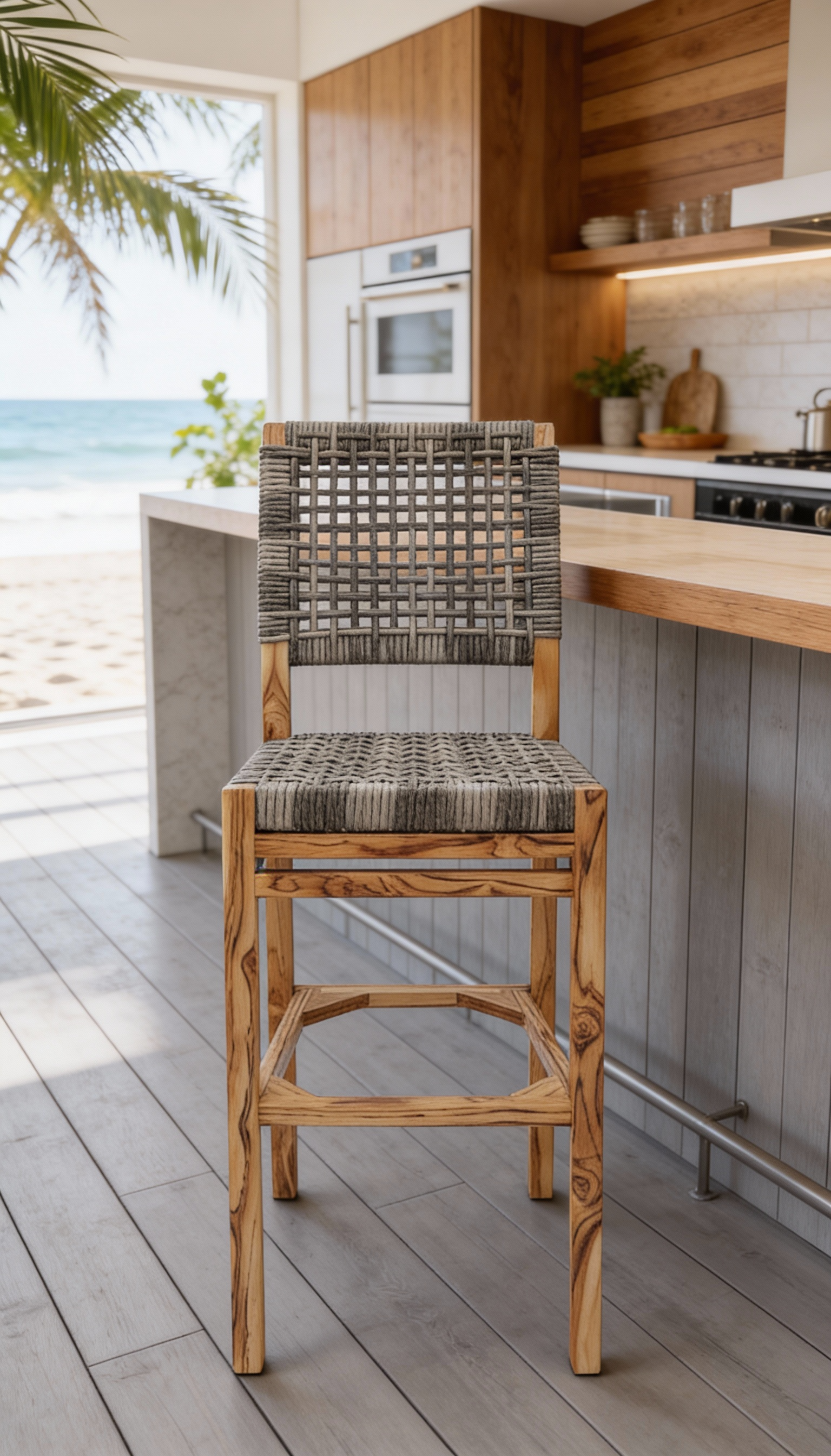 Materiales: Armazón de madera, tejido con rejilla sintética, cojín hule espuma de alta densidad, funda interna, funda externa en tela resistente al sol y la intemperie con cierres reforzados.