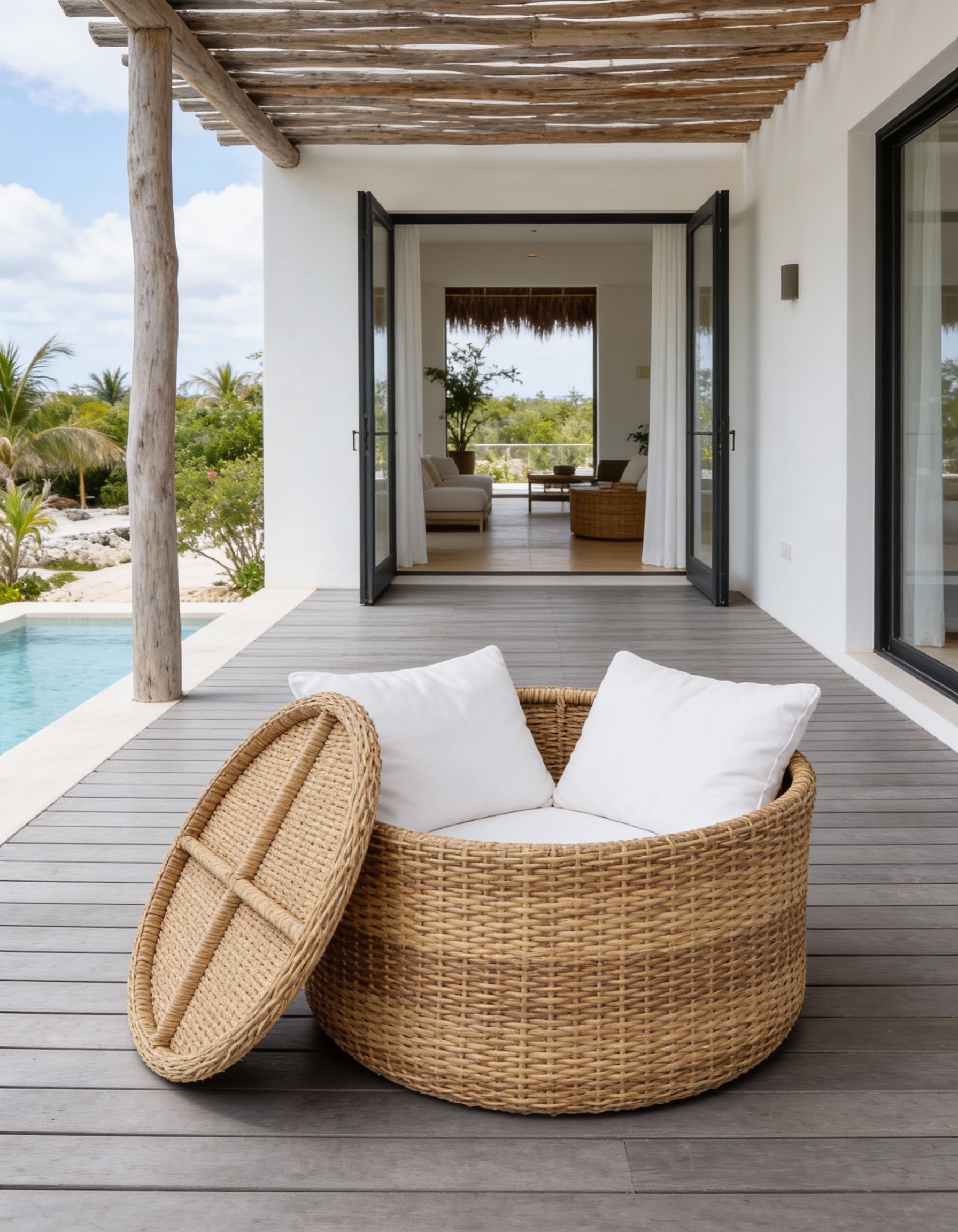 Estructura en aluminio y tejido con rejilla sintética, resistente al sol y la intemperie.