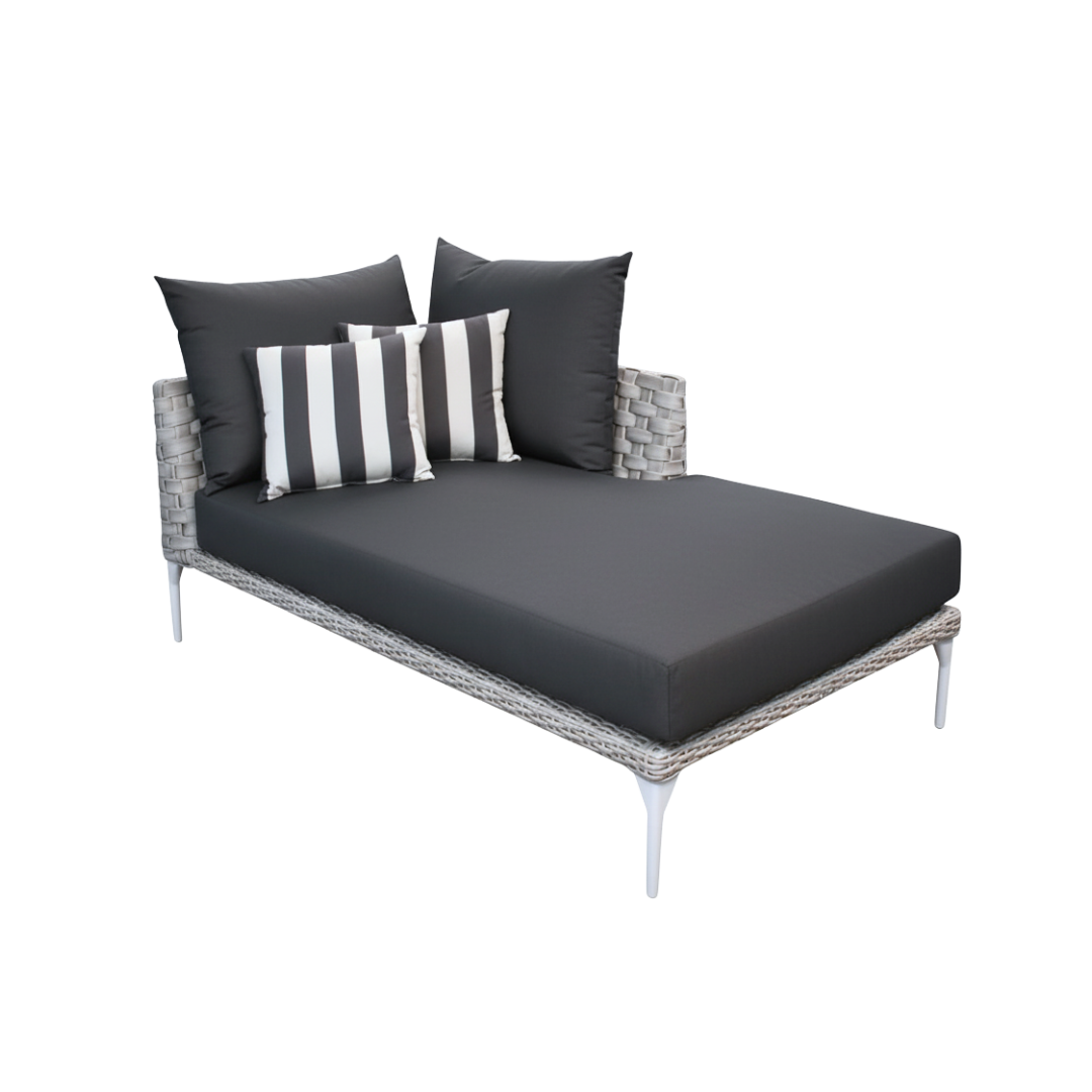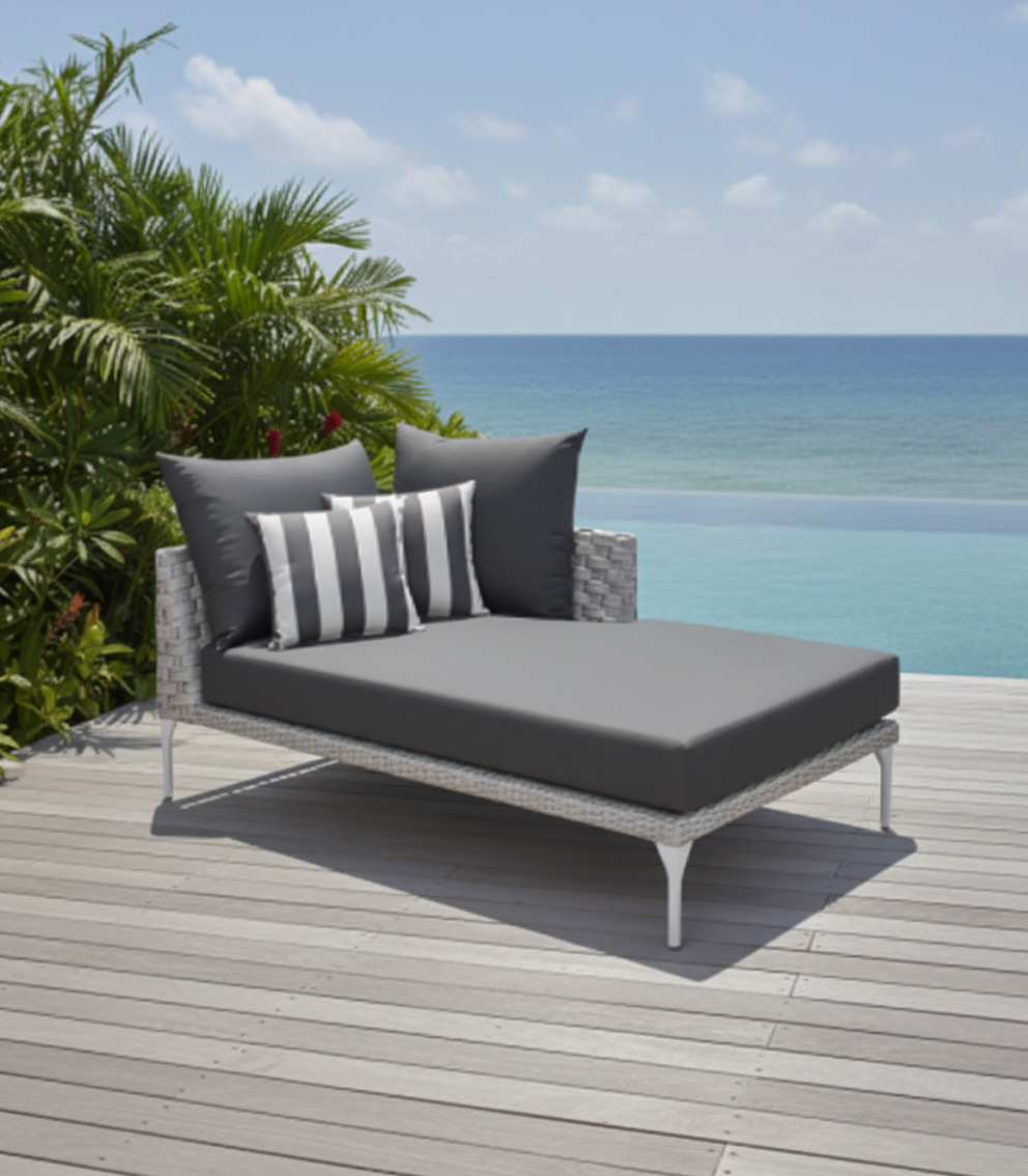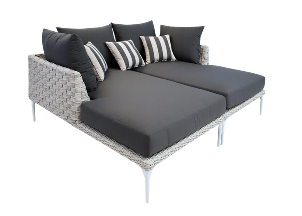 Fabricado con una estructura de aluminio, tejido con rejilla sintética de alta calidad, cojineria en tela sumbrella con espuma de alta densidad.