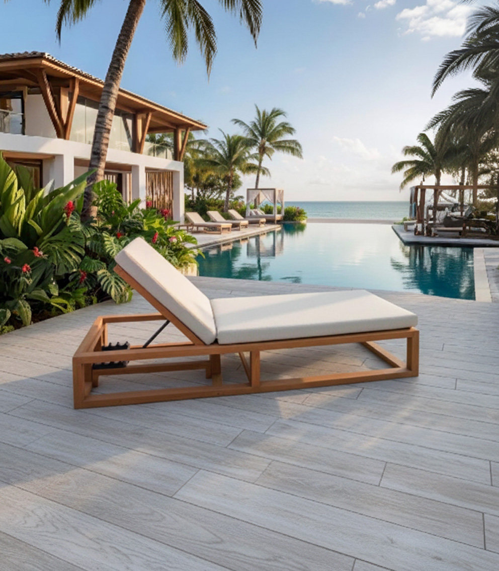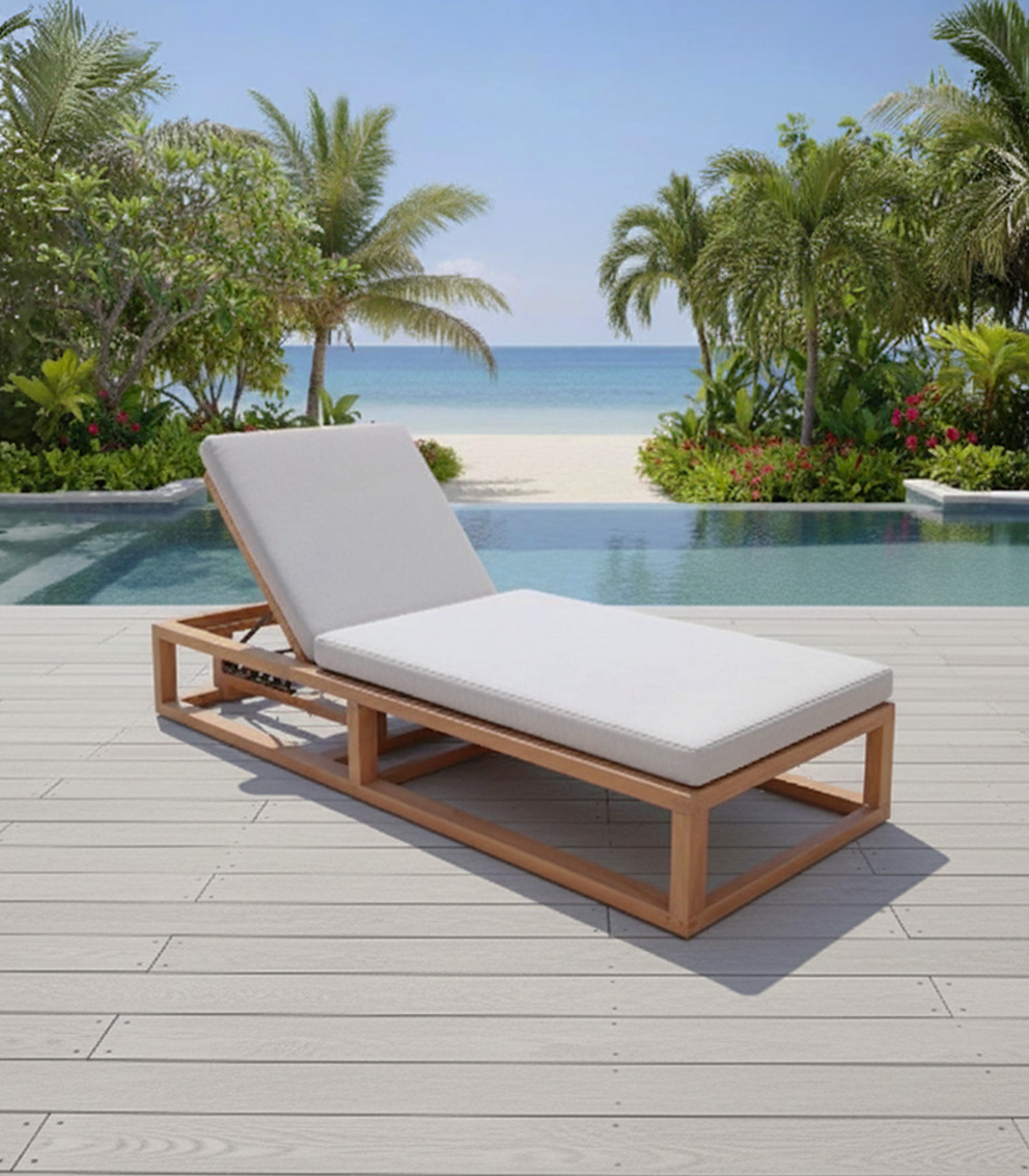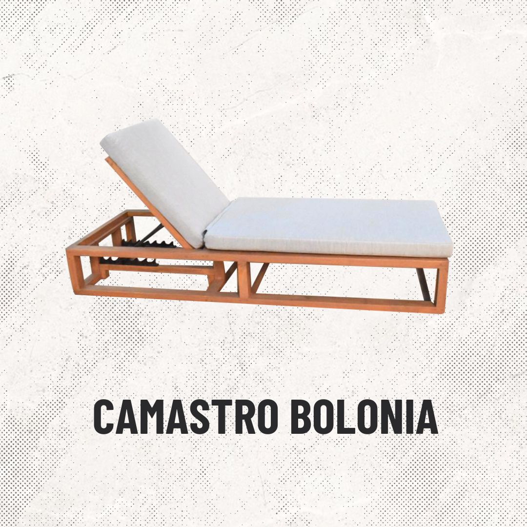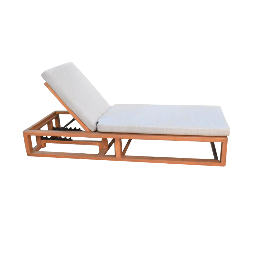 Camastro fabricado con estructura de madera, cojinería fabricada con hule espuma de alta densidad y tela resistente al sol y la intemperie.