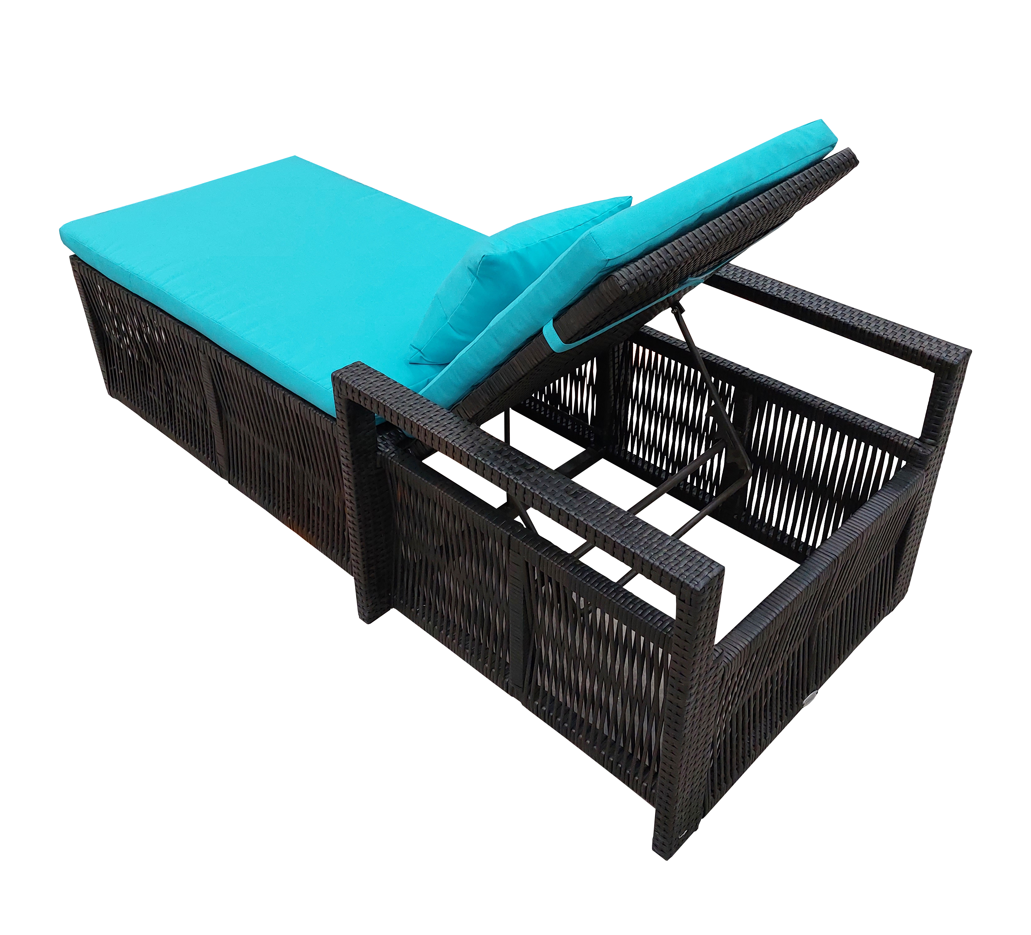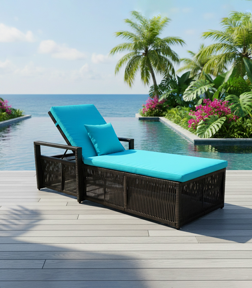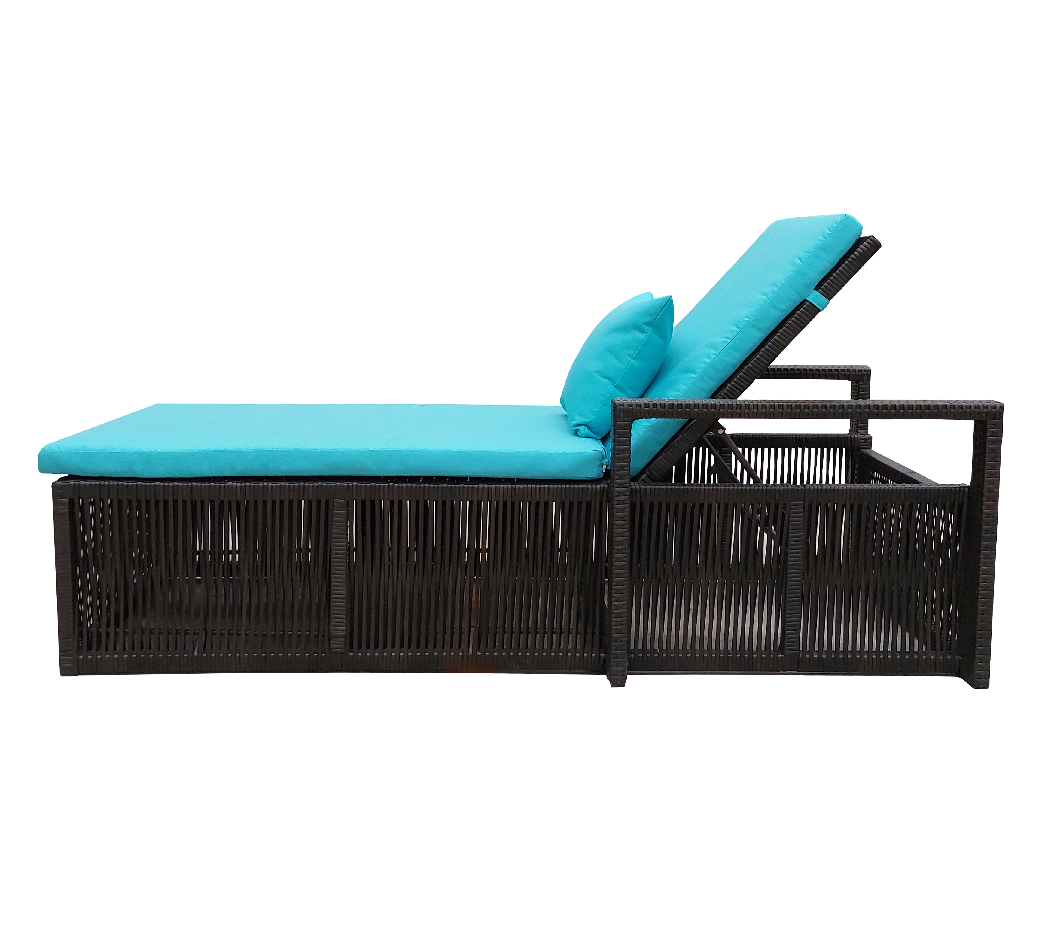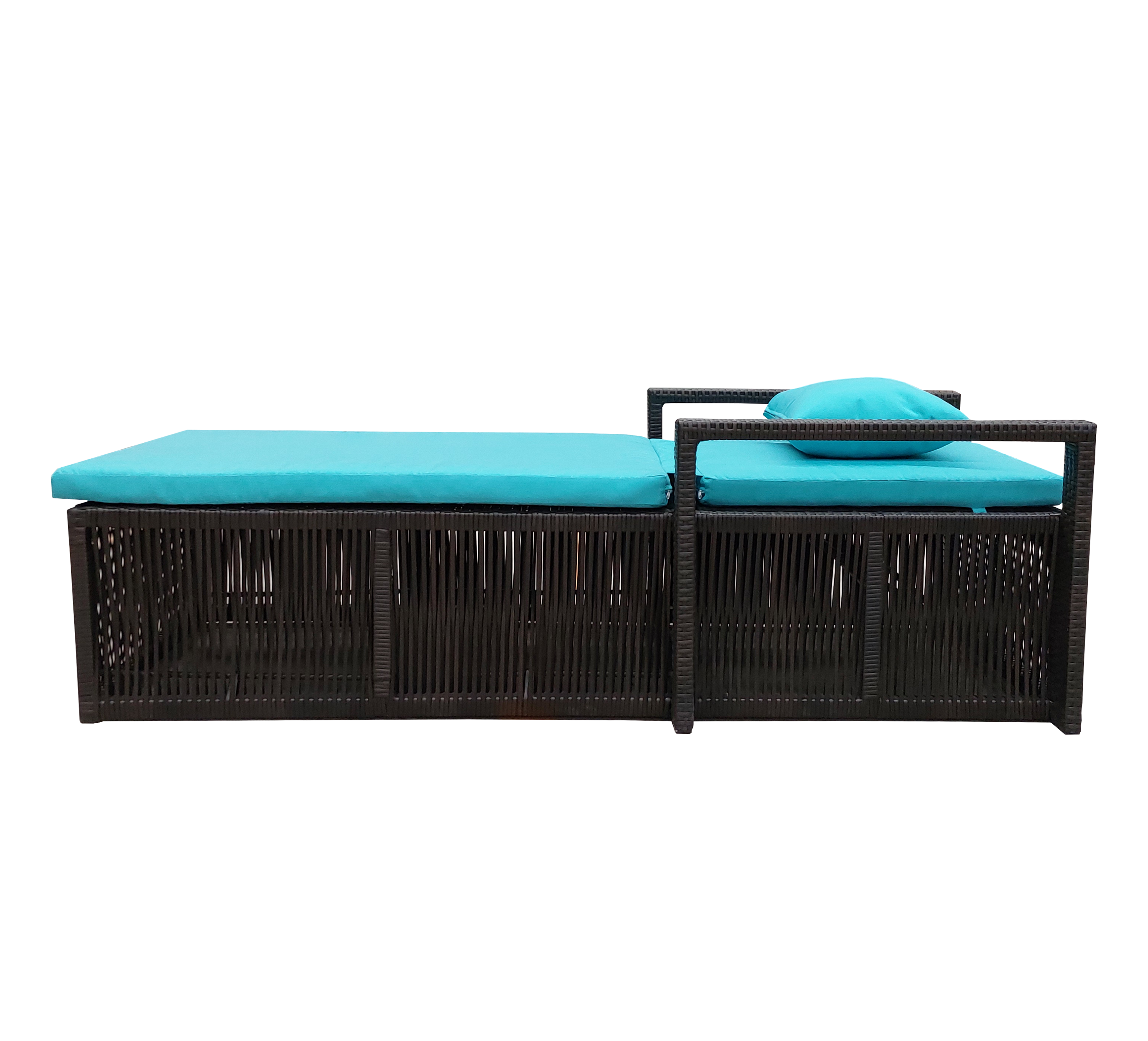 Camastro fabricado con una estructura de aluminio, tejido con rejilla sintética de alta calidad, cojineria en tela sumbrella con espuma de alta densidad.