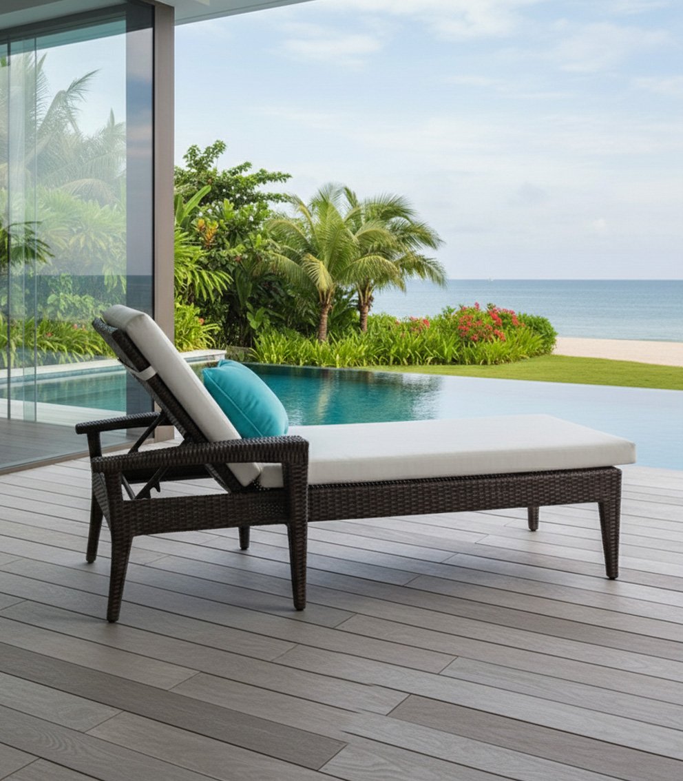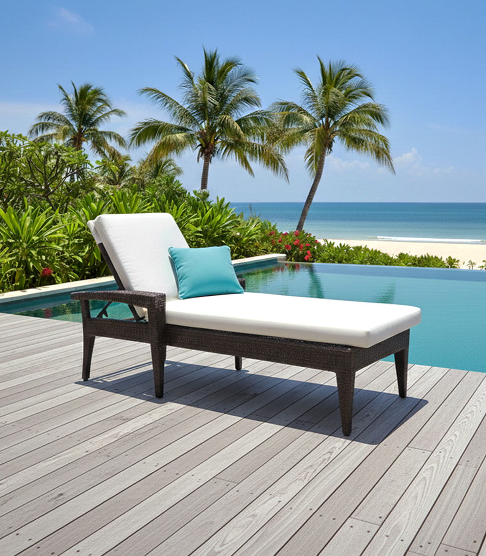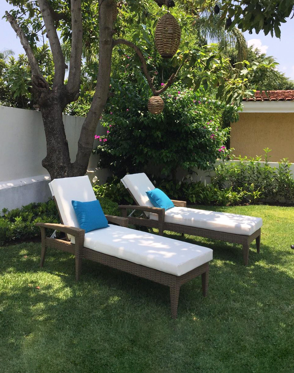 Camastro fabricado con una estructura de madera y aluminio, tejido con rejilla sintética de alta calidad, cojineria en tela sumbrella con espuma de alta densidad.