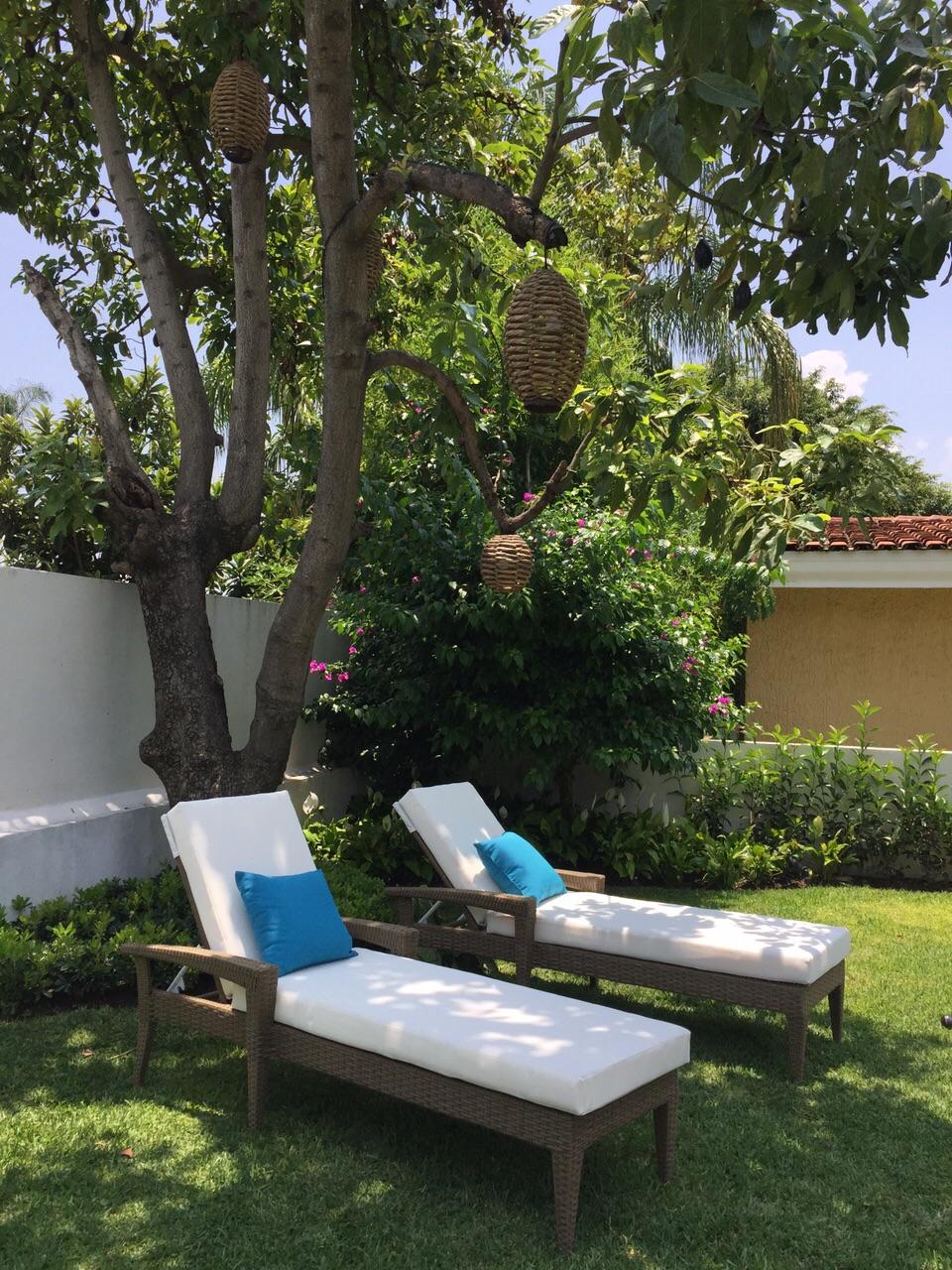 Camastro fabricado con estructura de madera, cojinería fabricada con hule espuma de alta densidad y tela resistente al sol y la intemperie.
