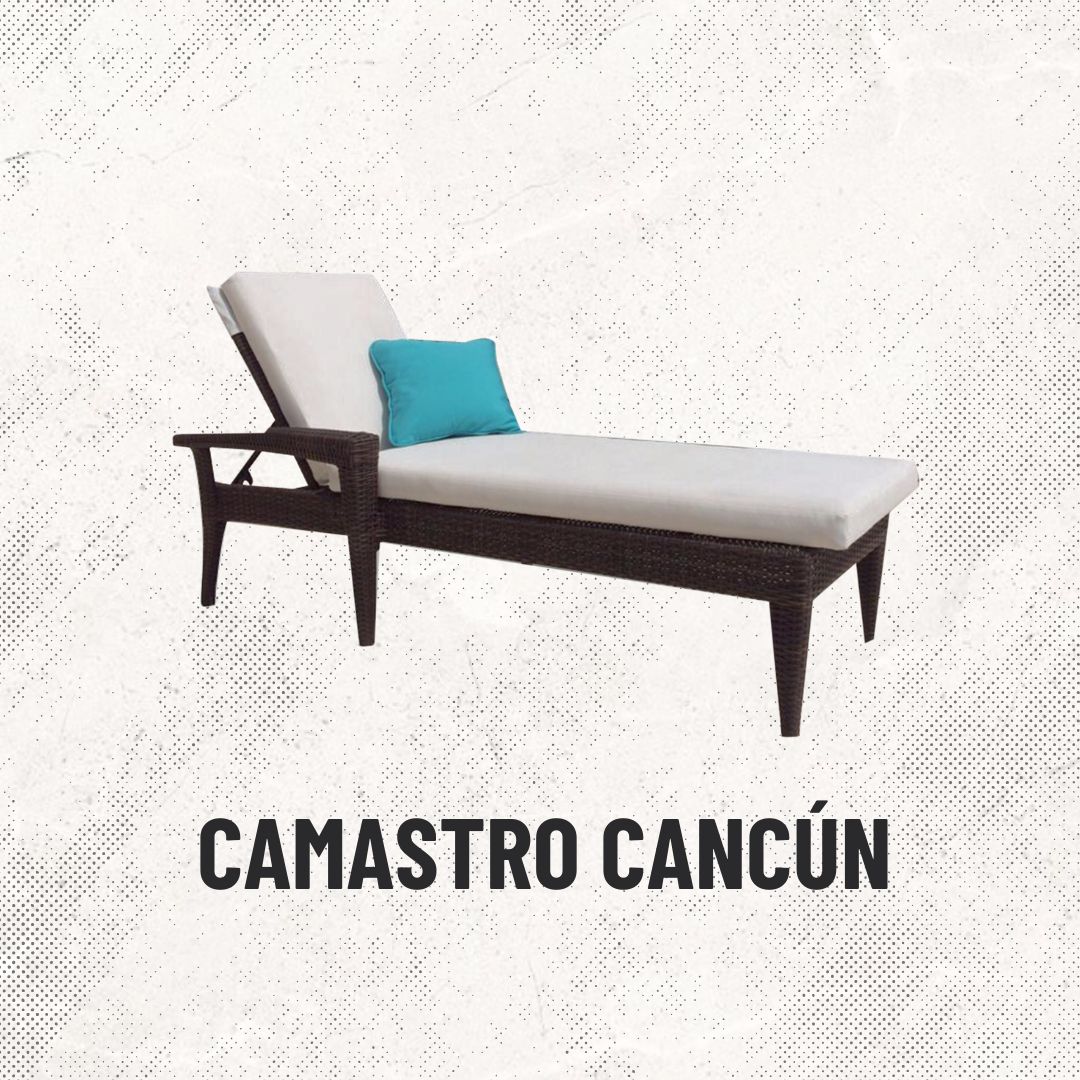 Camastro fabricado con estructura de aluminio, tejidas con rejilla sintética, cojinería fabricada con hule espuma de alta densidad y tela resistente al sol y la intemperie.