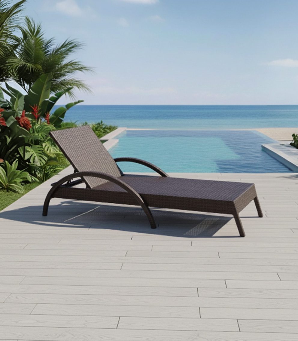 Camastro fabricado con un armazón de aluminio y una base de madera, tejido con rejilla sintética de alta calidad, cojines en tela sumbrella con espuma de alta densidad.