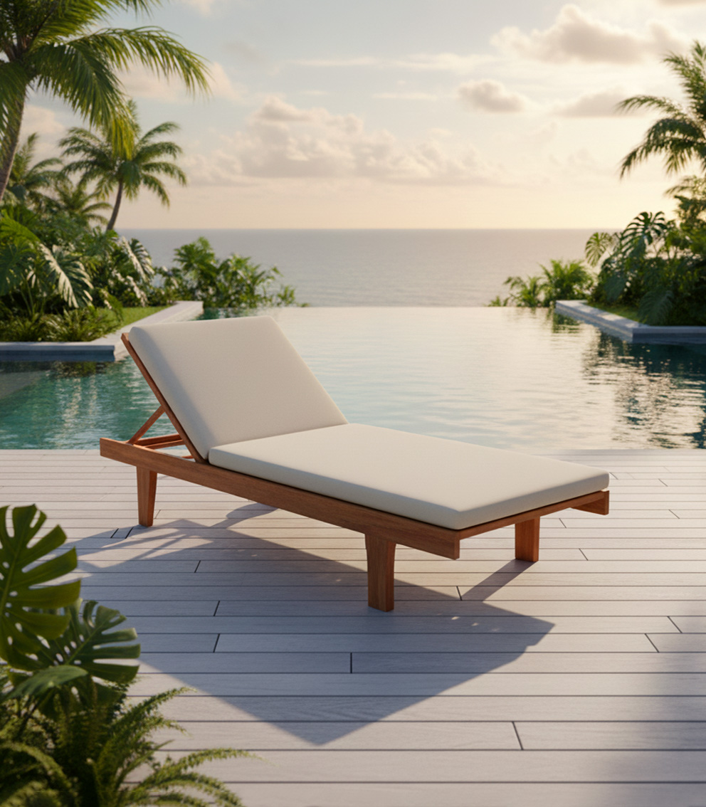 Silla tipo camastro, fabricada con estructura de aluminio, tejidas con rejilla sintética, cojinería fabricada con hule espuma de alta densidad y tela resistente al sol y la intemperie.
