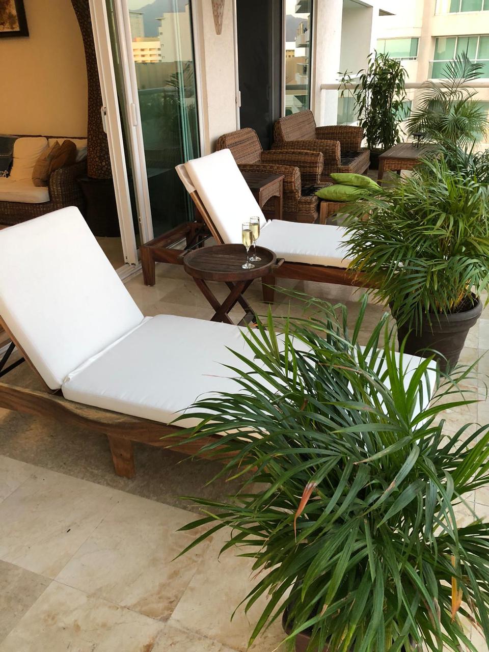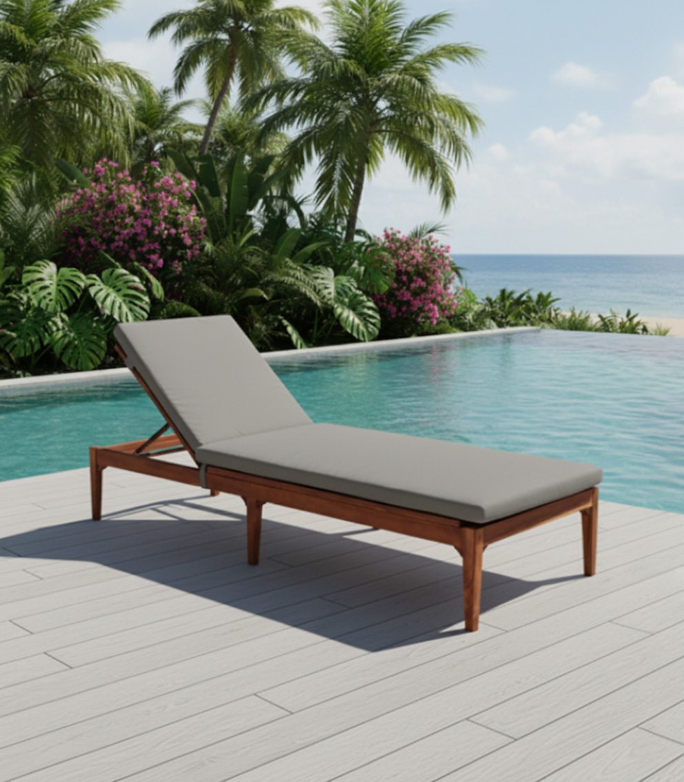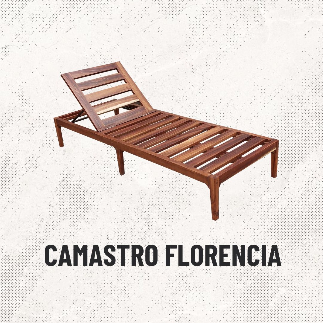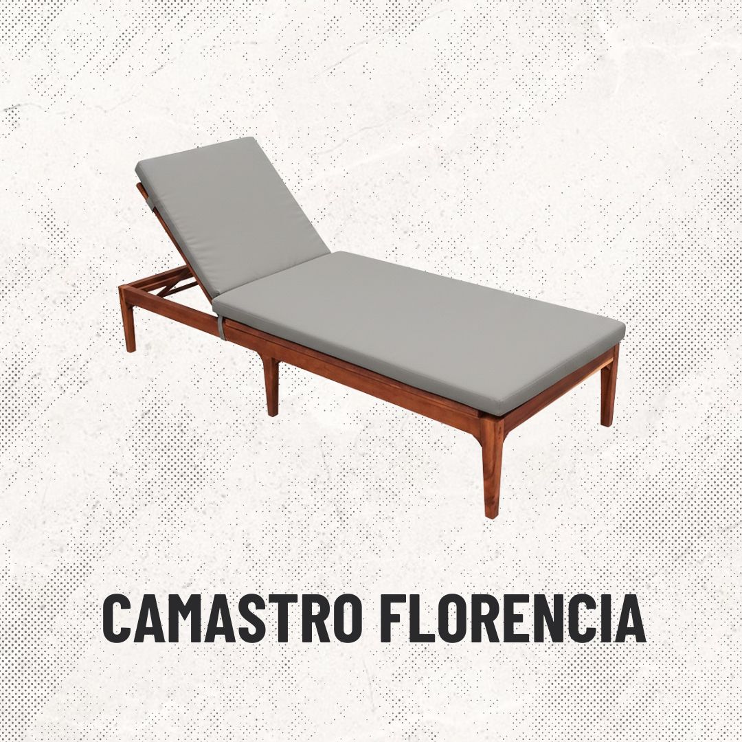 Camastro fabricado con estructura de madera, cojinería fabricada con hule espuma de alta densidad y tela resistente al sol y la intemperie.
