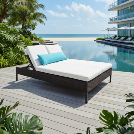 Camastro doble, fabricado con estructura de aluminio, tejido con rejilla sintética, cojinería fabricada con hule espuma de alta densidad y tela resistente al sol y la intemperie.