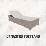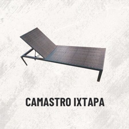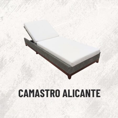 Camastro fabricado con estructura de aluminio, tejidas con rejilla sintética, cojinería fabricada con hule espuma de alta densidad y tela resistente al sol y la intemperie.