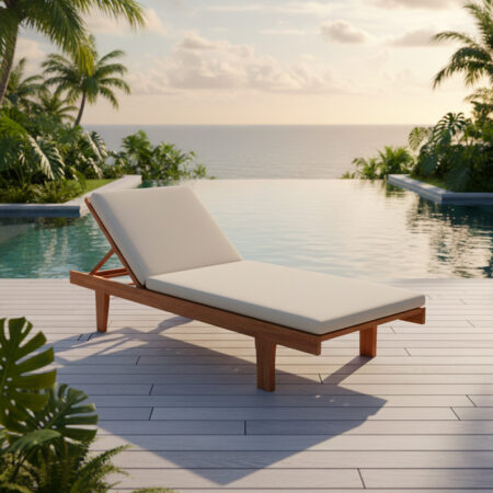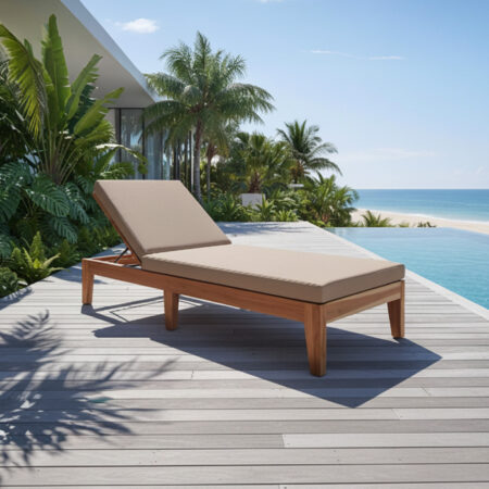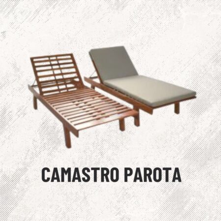 Camastro fabricado con estructura de madera, cojinería fabricada con hule espuma de alta densidad y tela resistente al sol y la intemperie.