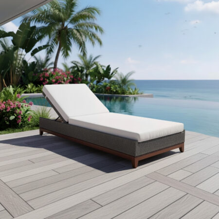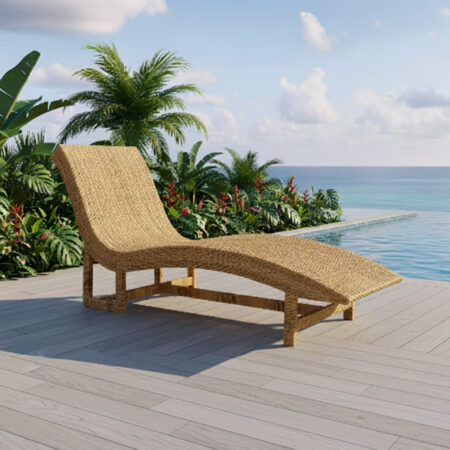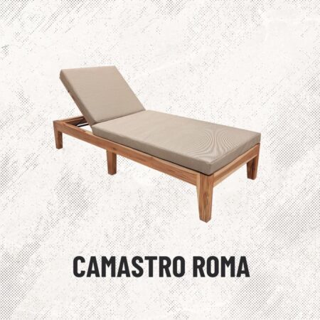 Camastro fabricado con un armazón de aluminio y una base de madera, tejido con rejilla sintética de alta calidad, cojines en tela sumbrella con espuma de alta densidad.
