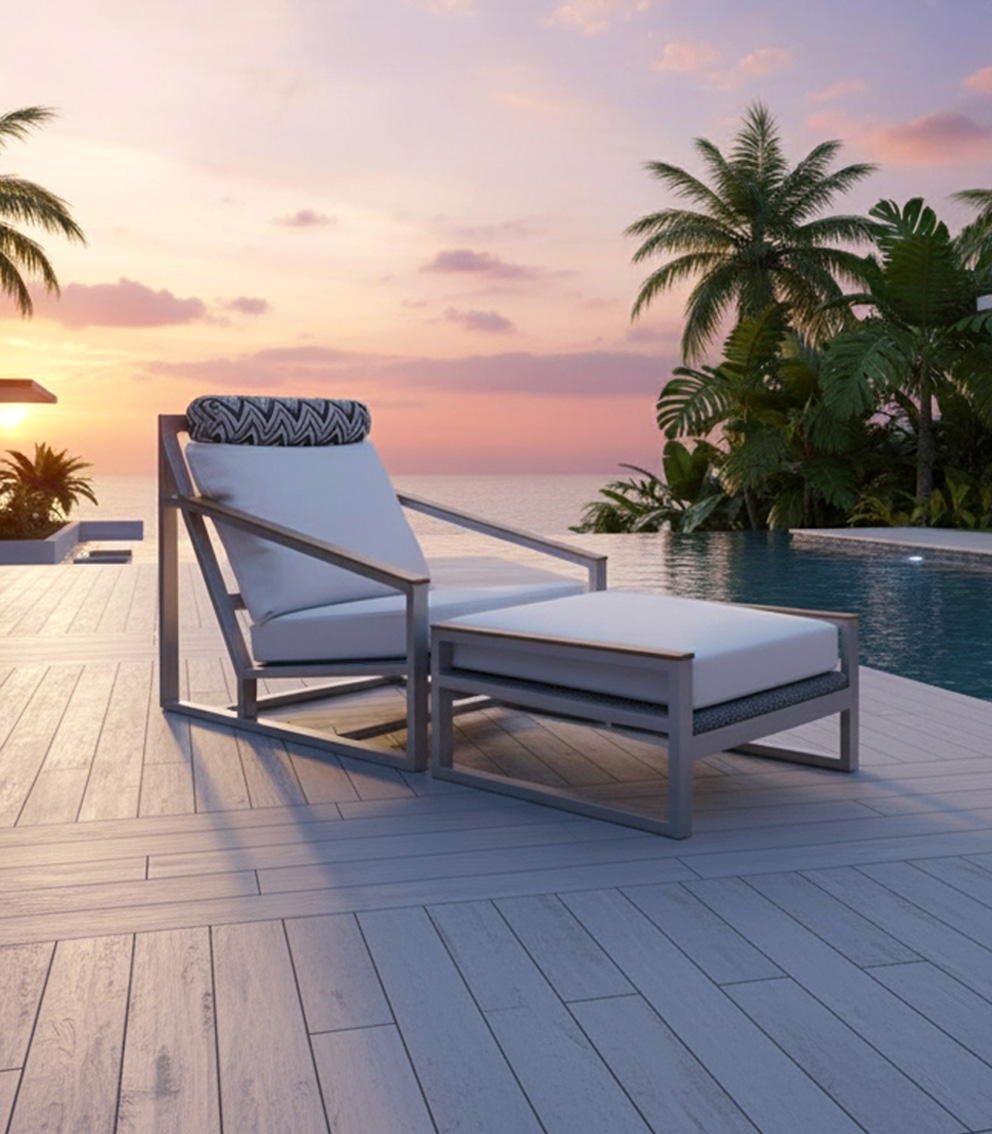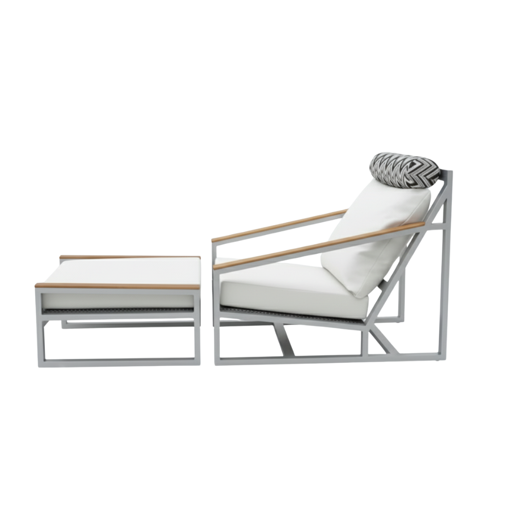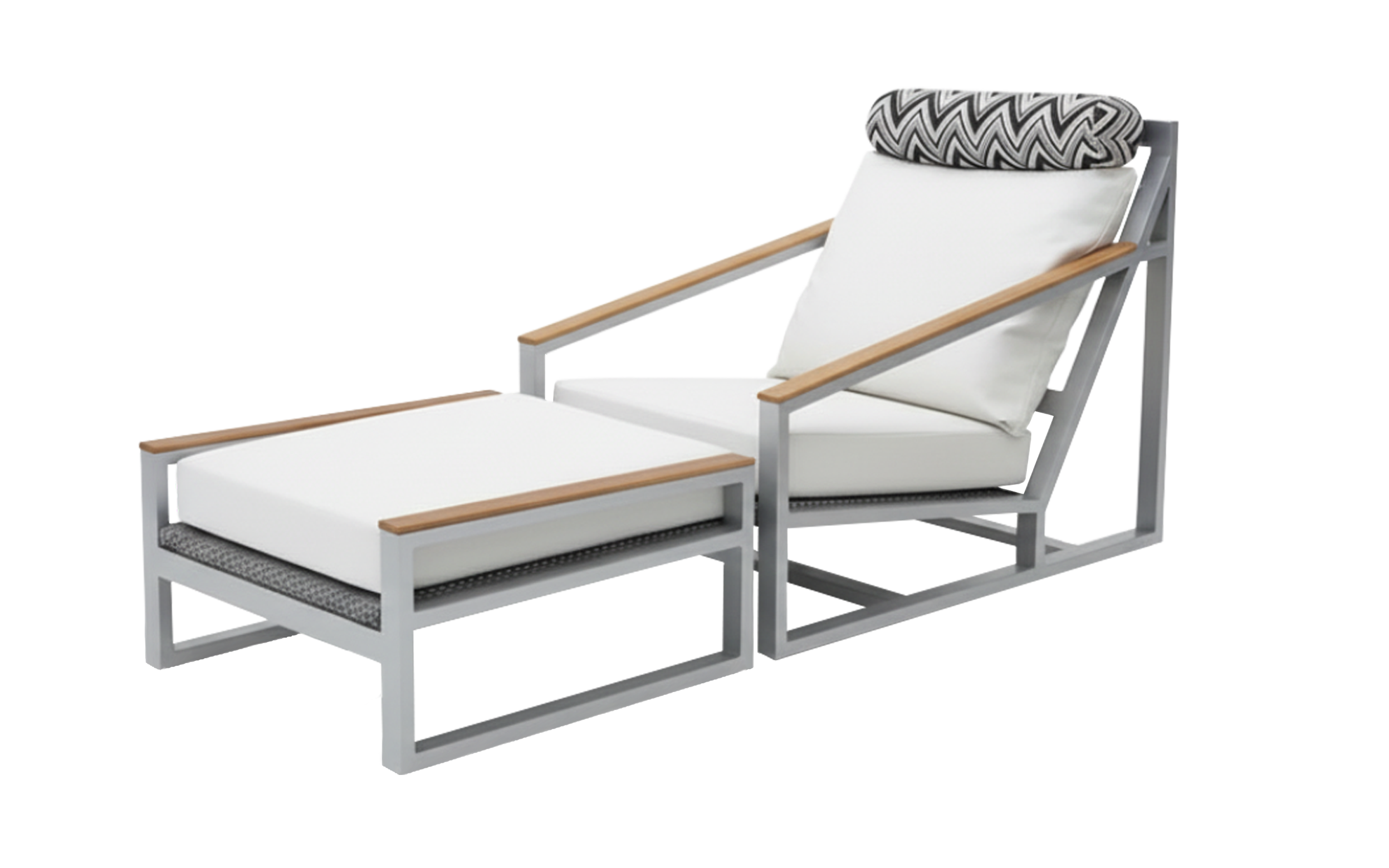 Estructura de aluminio, tejido con rejilla sintética de alta calidad, cojineria en tela sumbrella y espuma de alta densidad.