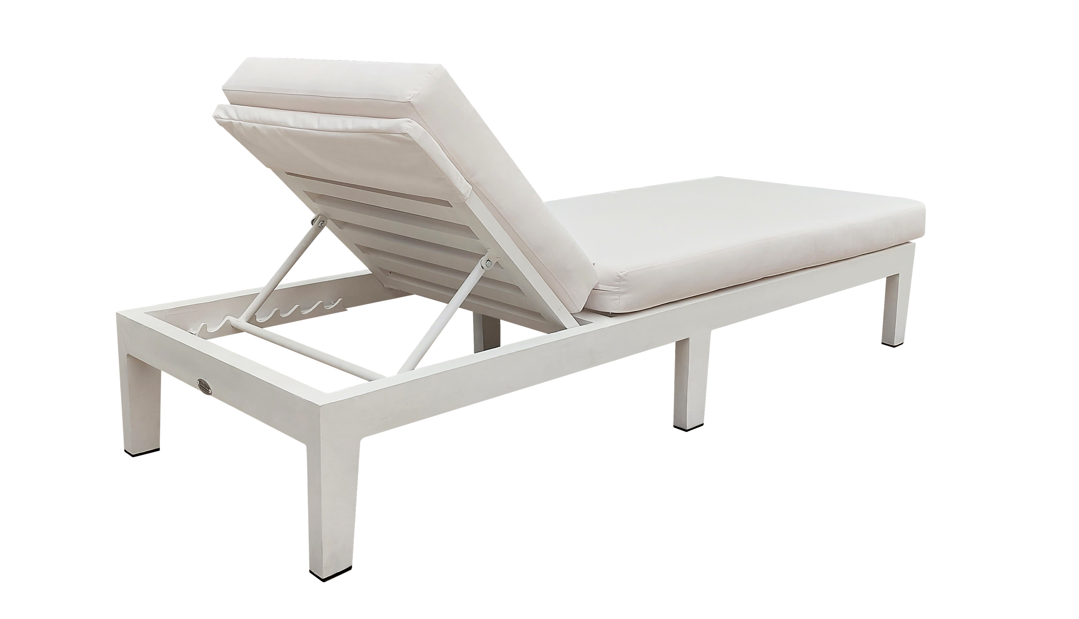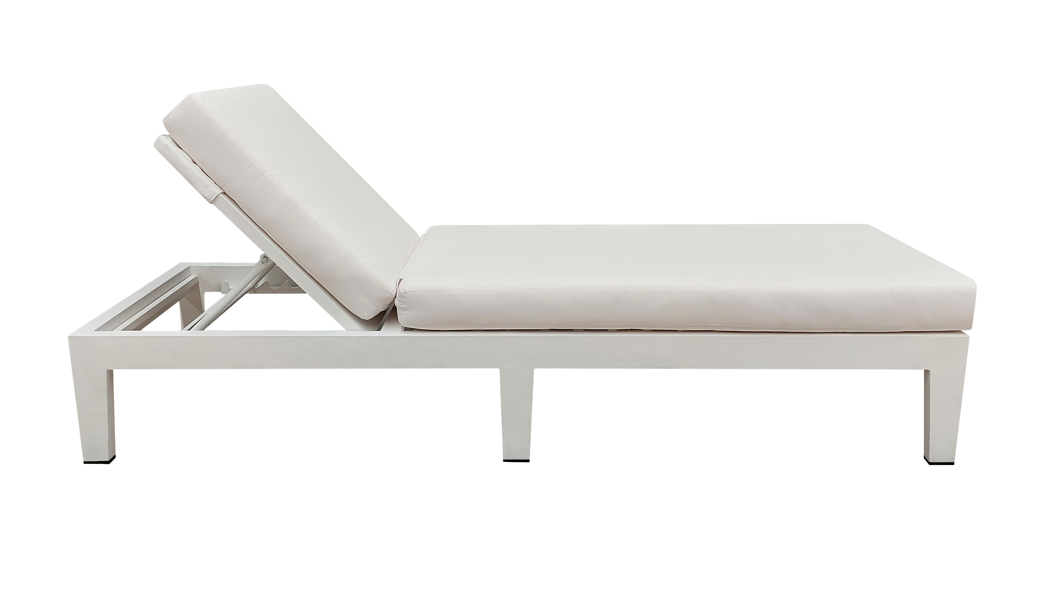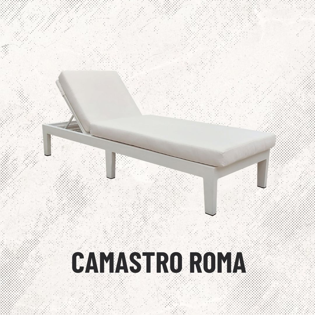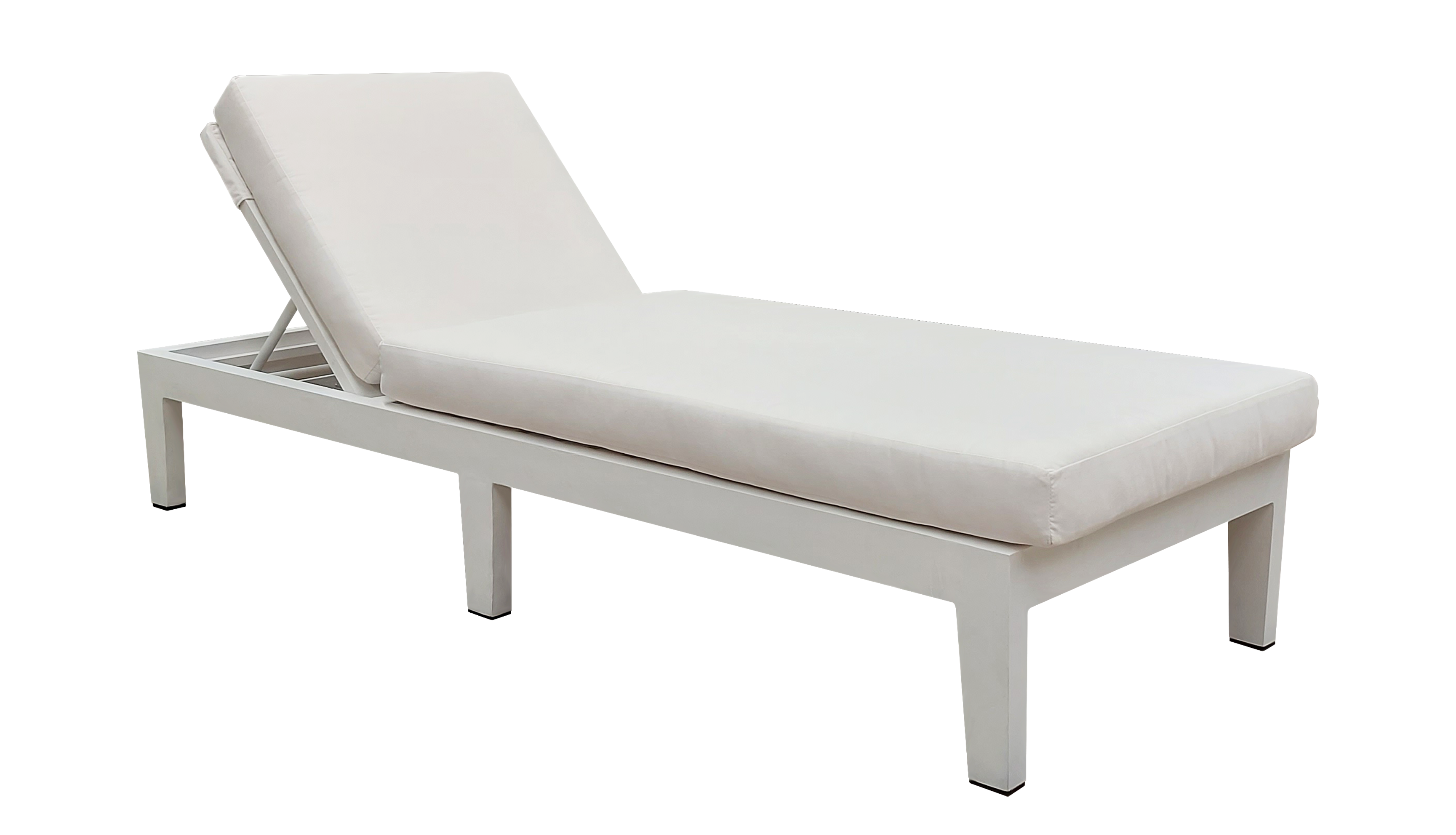 Camastro fabricado con estructura de aluminio, cojinería fabricada con hule espuma de alta densidad y tela resistente al sol y la intemperie.