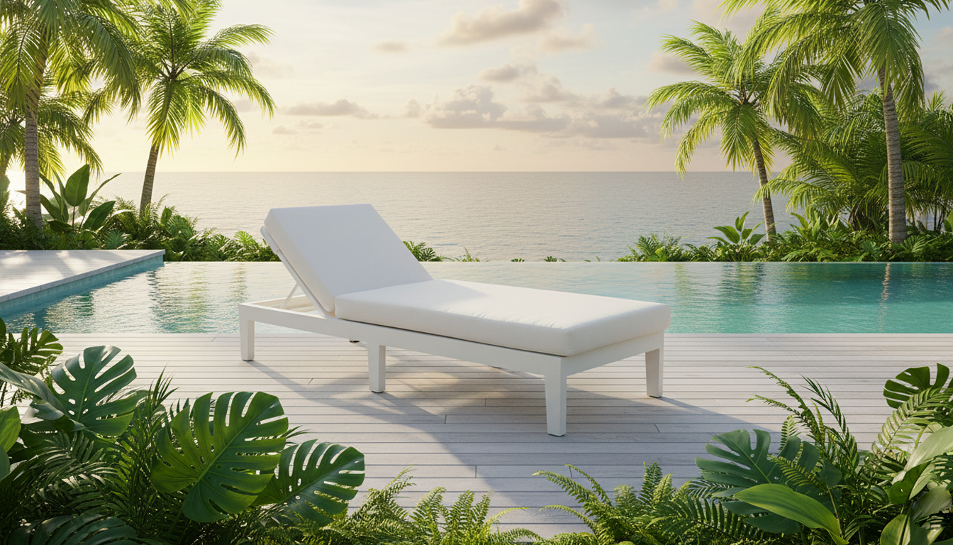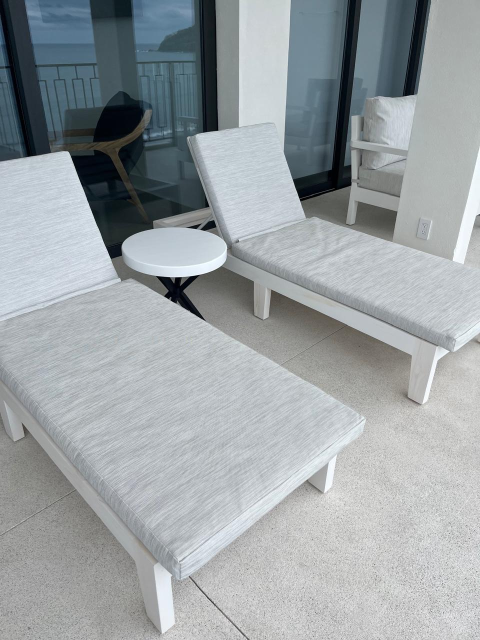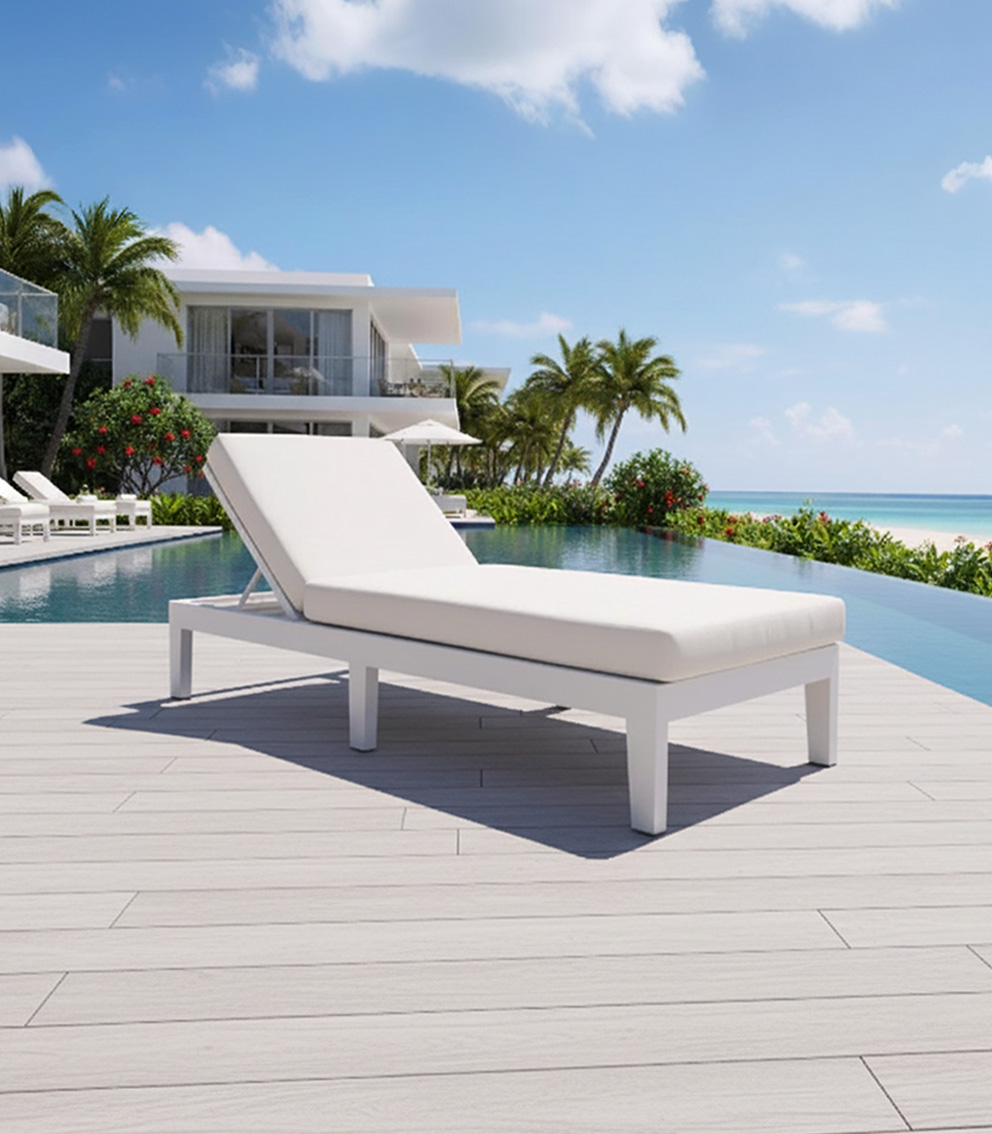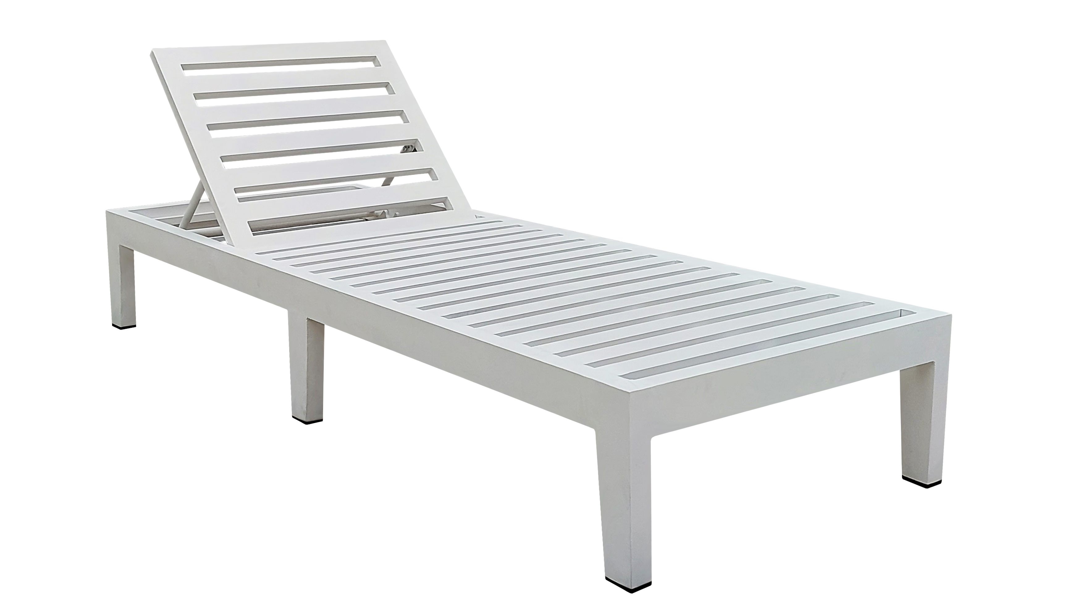 Camastro fabricado con estructura de aluminio, cojinería fabricada con hule espuma de alta densidad y tela resistente al sol y la intemperie.