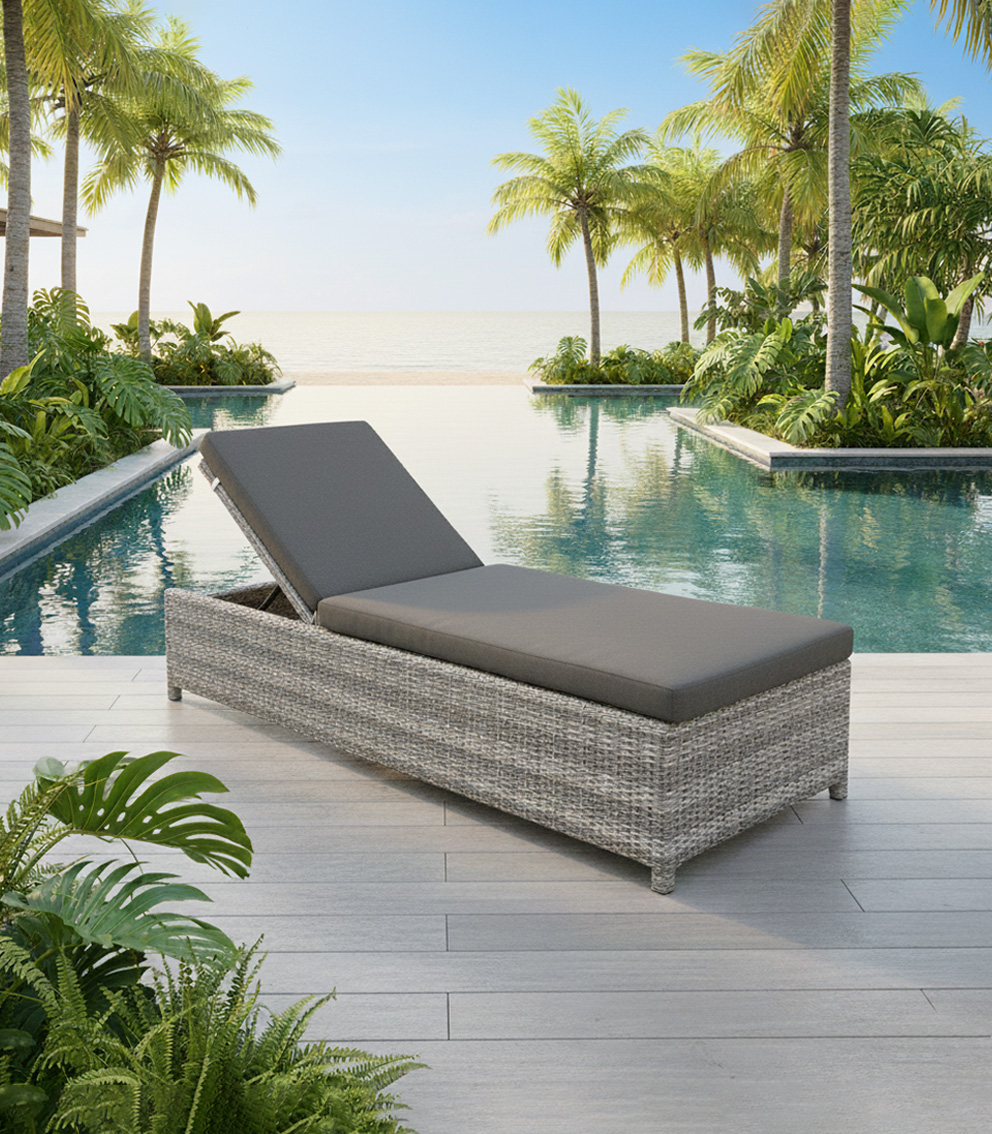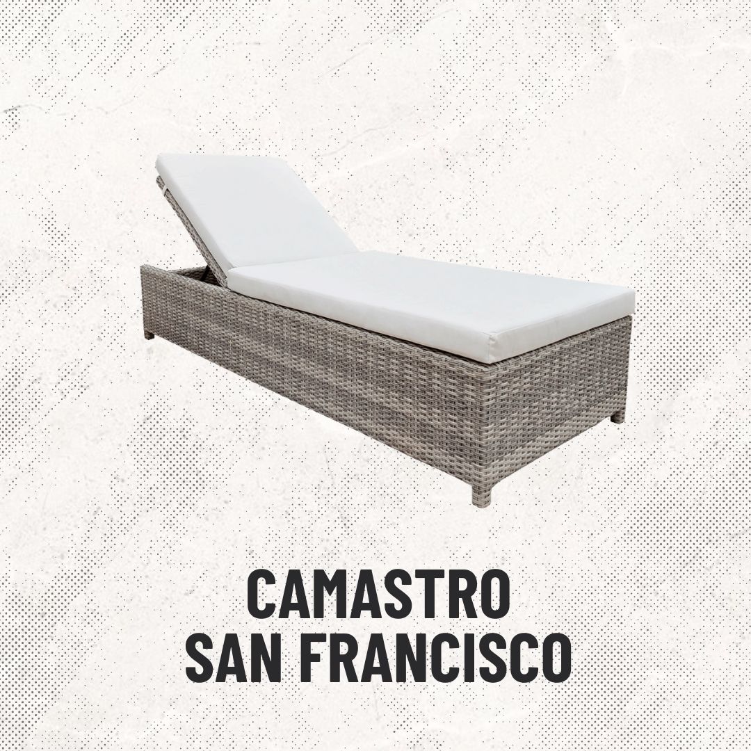 Camastro fabricado con una estructura de aluminio, tejido con rejilla sintética de alta calidad, cojineria en tela sumbrella con espuma de alta densidad.