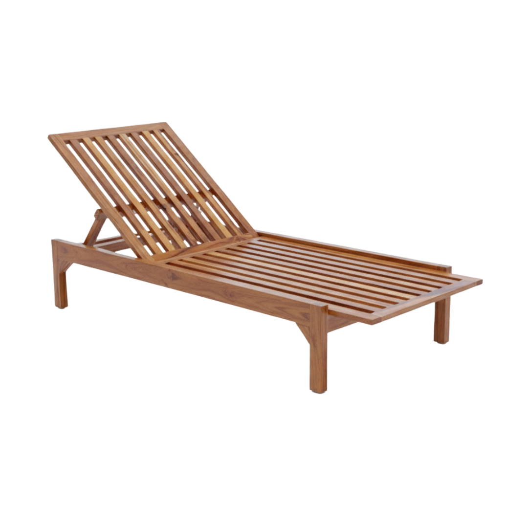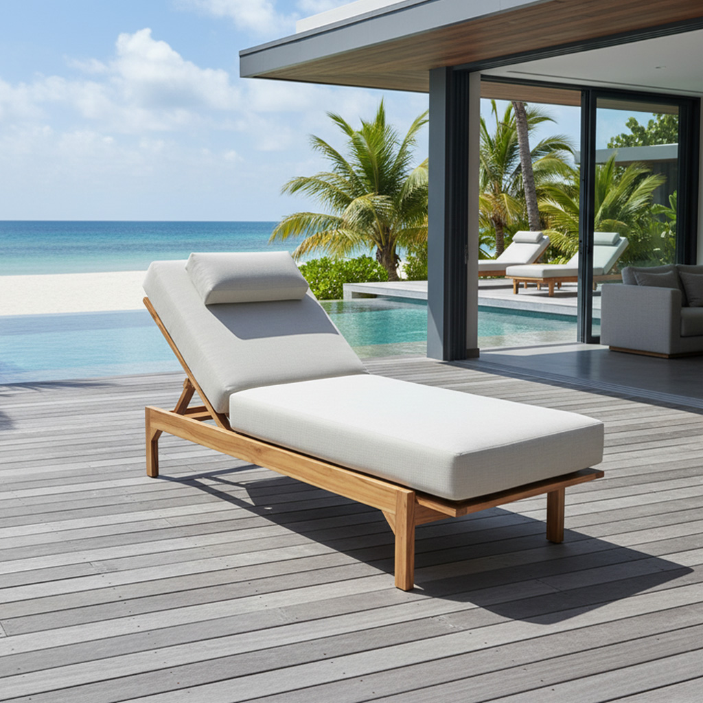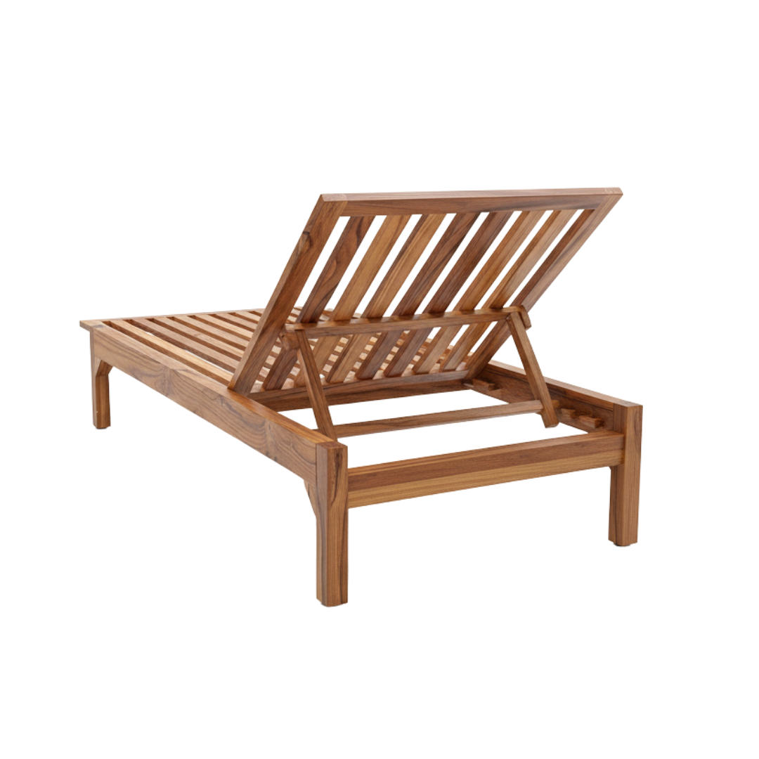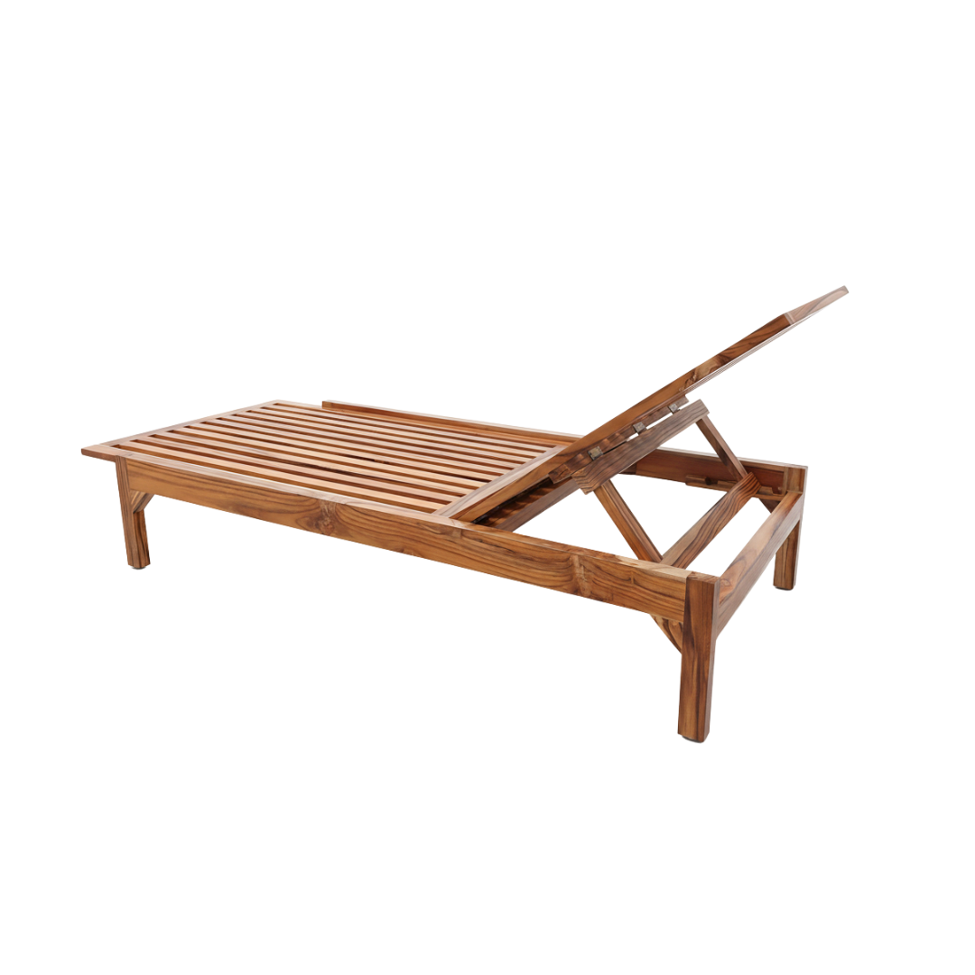 Camastro fabricado con estructura de madera, cojinería fabricada con hule espuma de alta densidad y tela resistente al sol y la intemperie.